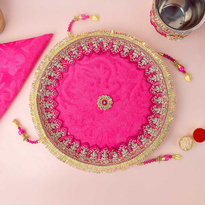 • Elegant Pink Embroidered Thali Set: The centerpiece thali is decorated with fine embroidery and includes all the traditional pooja accessories, including a channi (sieve) and lota, ensuring a complete ritual experience.