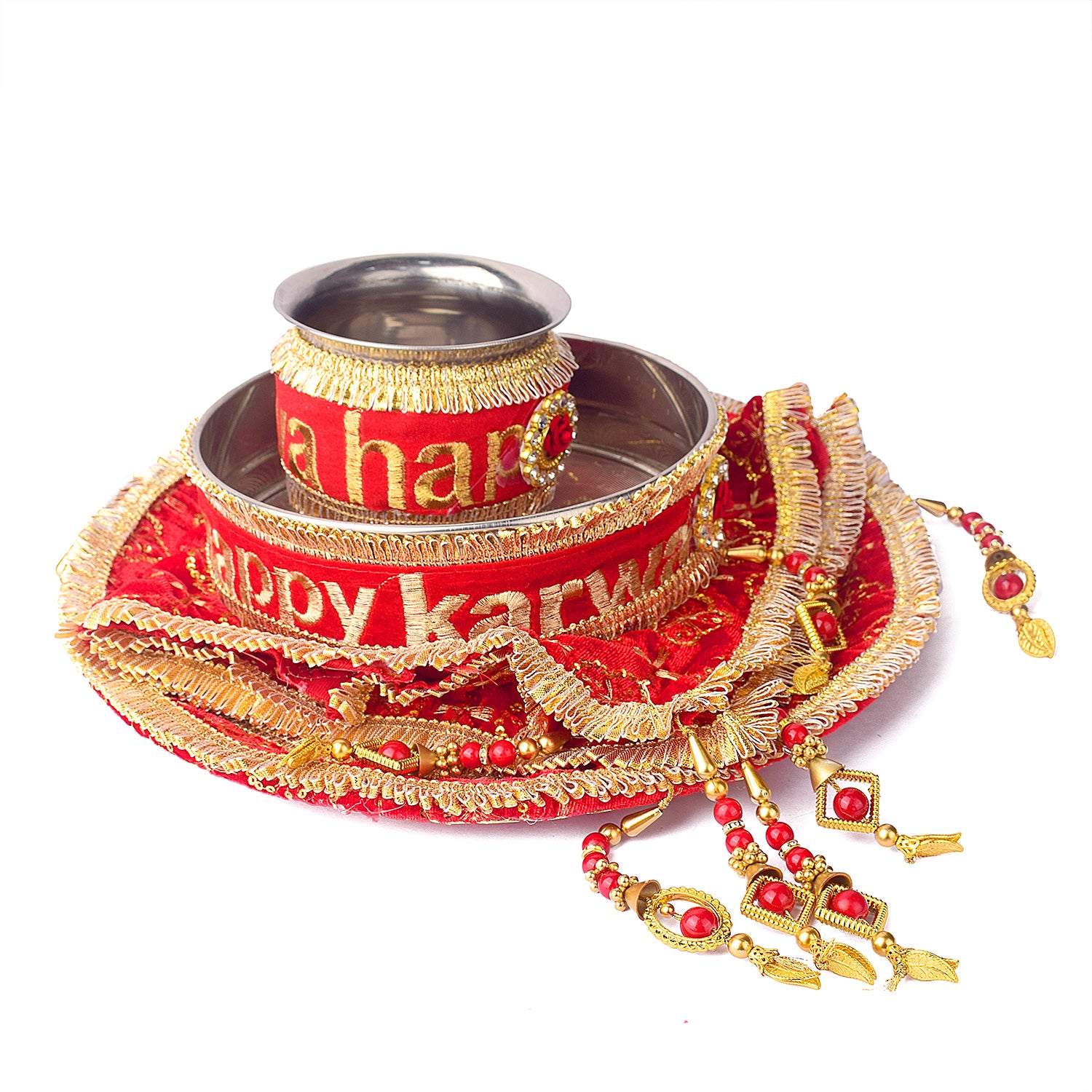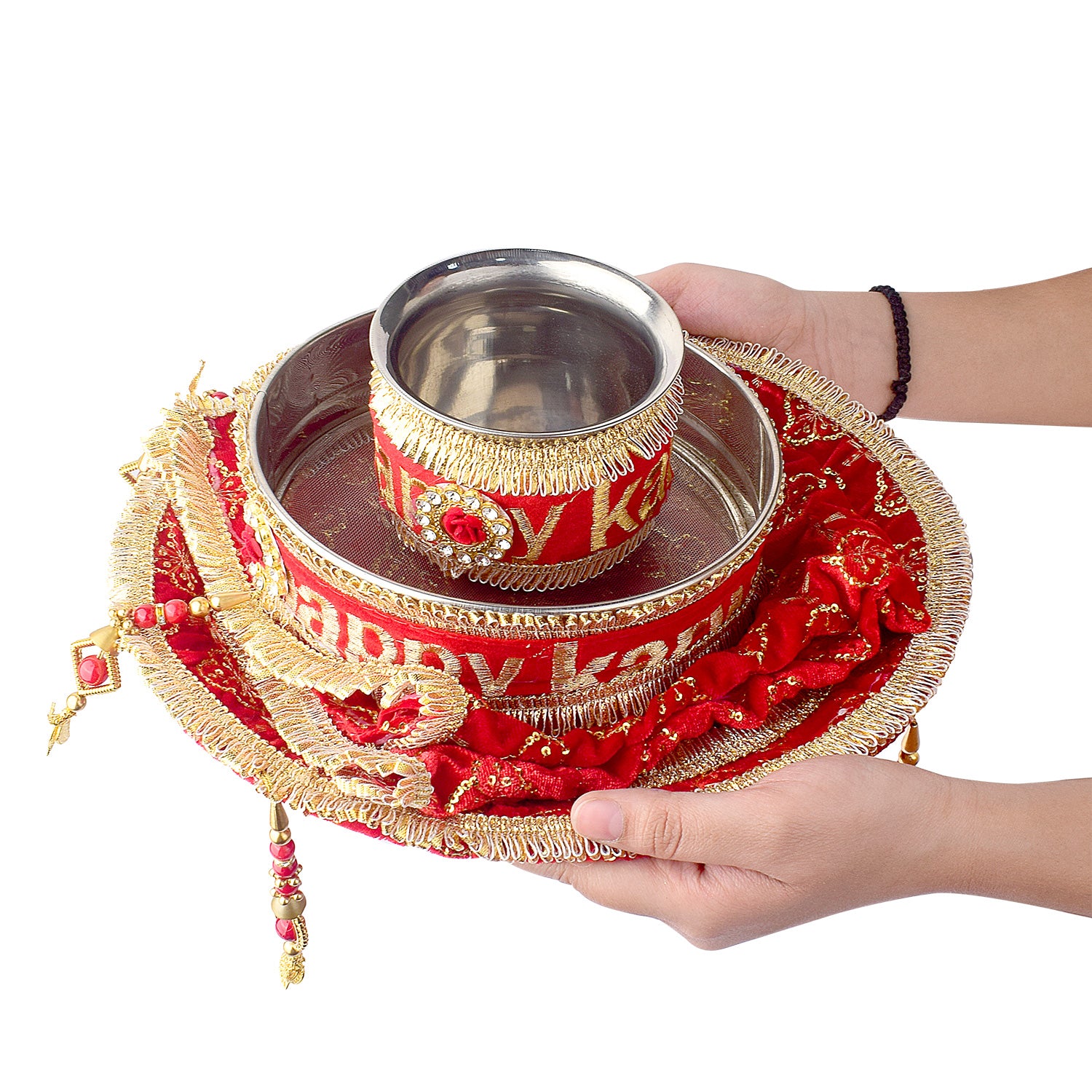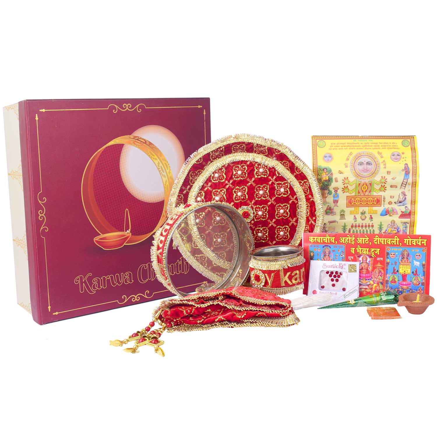 Shop Now Red Embroidery Karwa Chauth Thali Set 11 Pc | Satvikstore.in – satvikstore.in