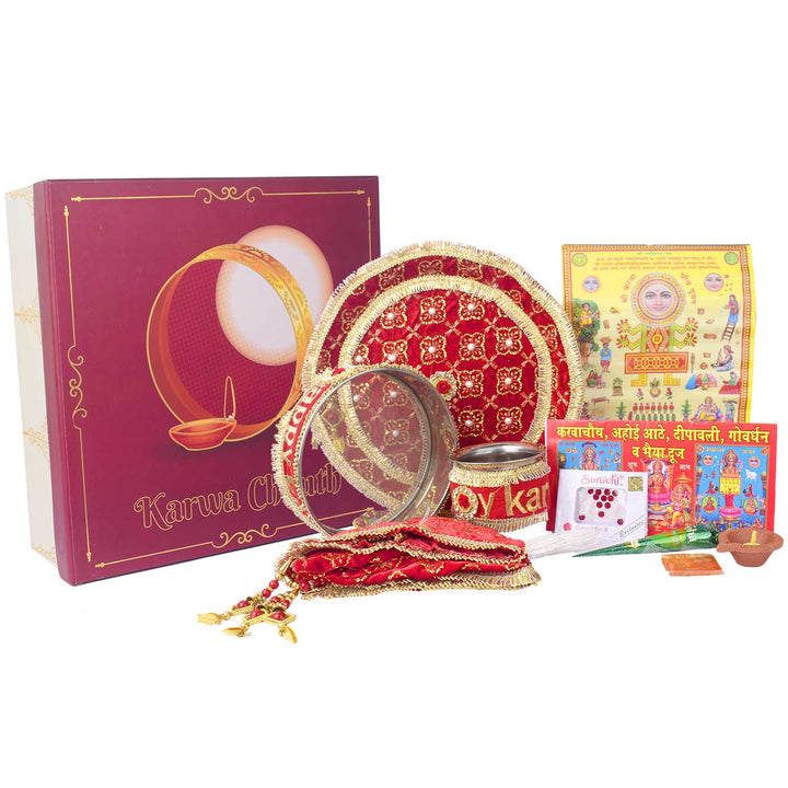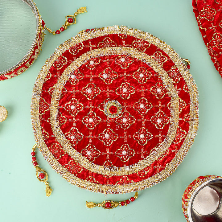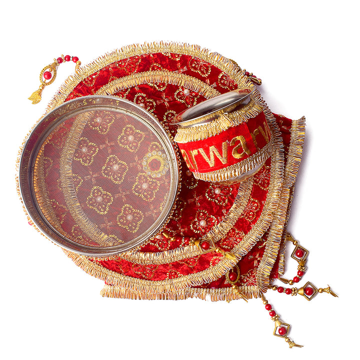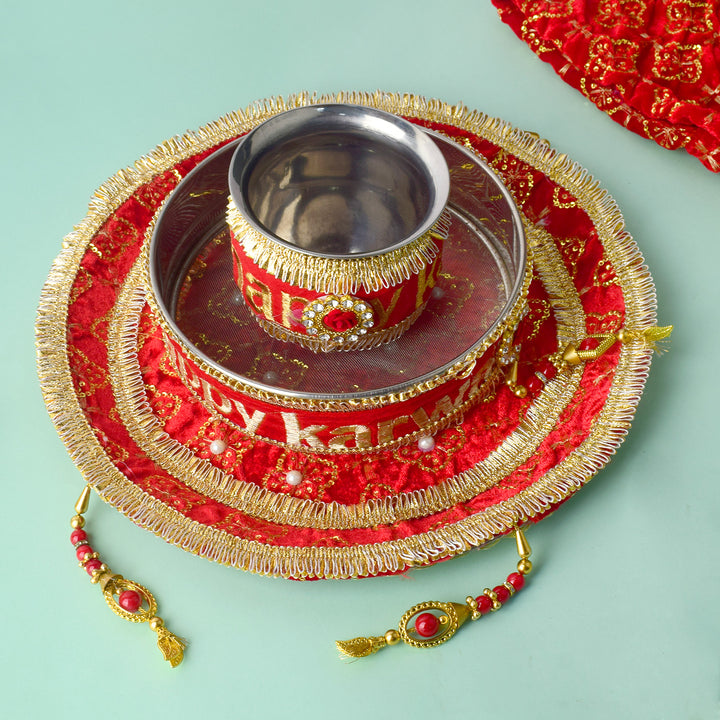 Item Name: 11 Pc Red Embroidery Karwa Chauth Thali Set with Cover – Complete Puja Kit