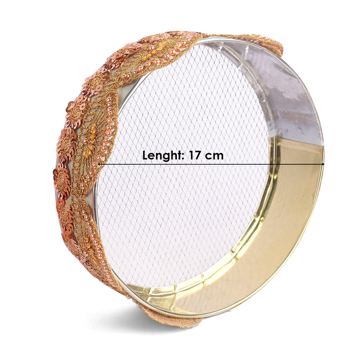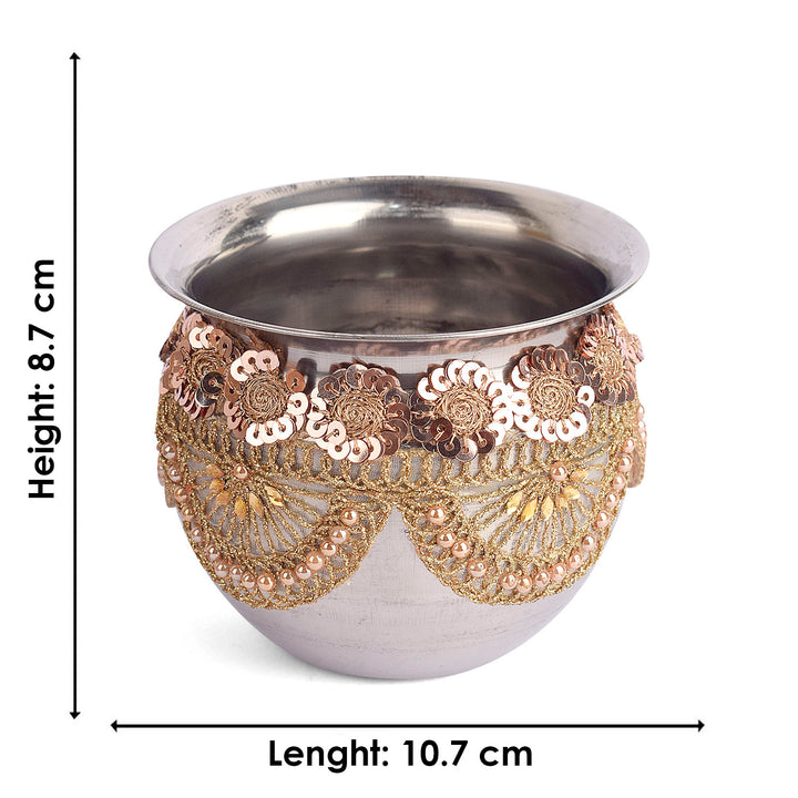 Design: Beautiful Handcrafted Designer Karwa Thali with Fabric all over the Thali and Lace Work all over the Lota and Sieve (Channi), Which makes it more Attractive.