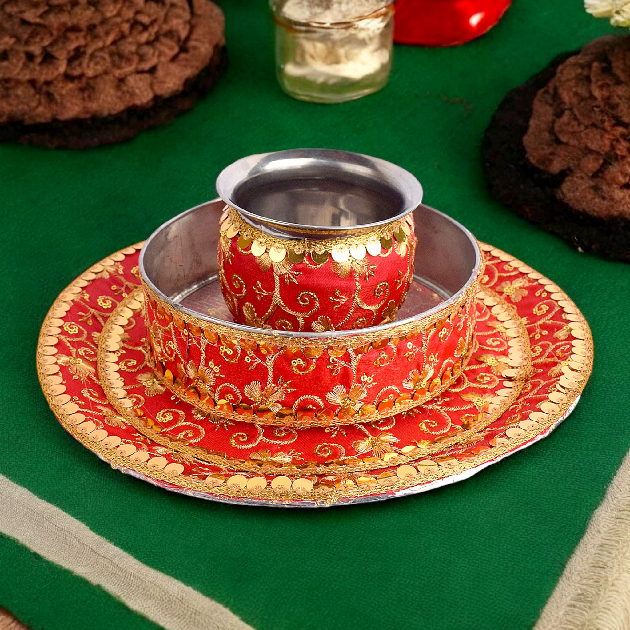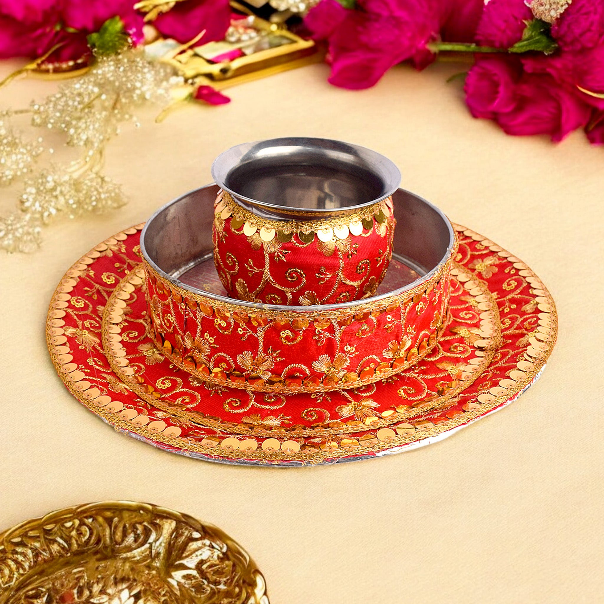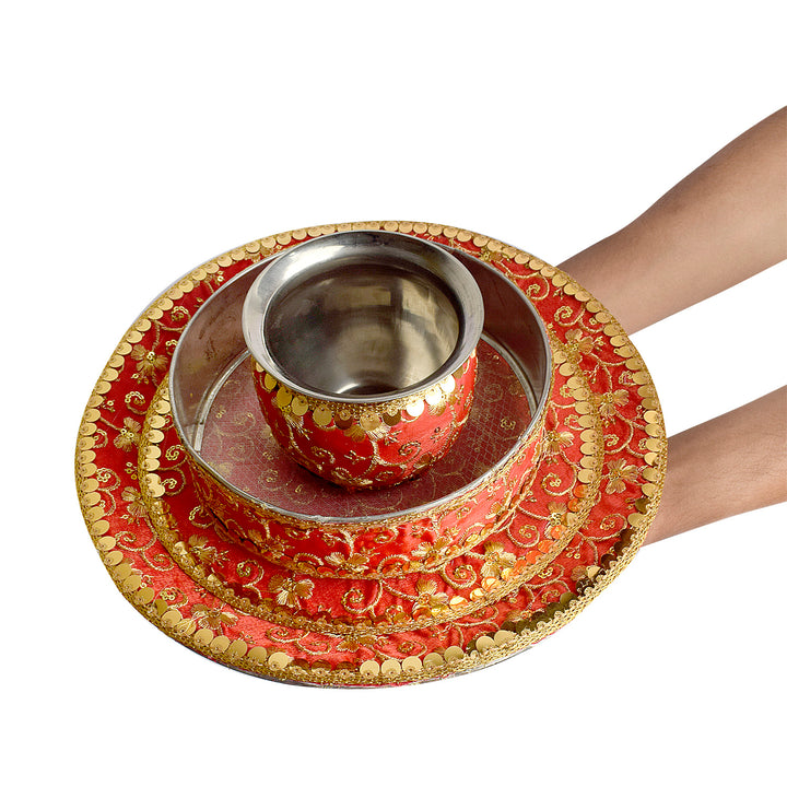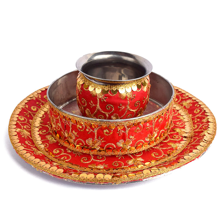 Elegant Red Embroidery Karwa Chauth Thali Set -3pc|Shopt at satvikstore.in