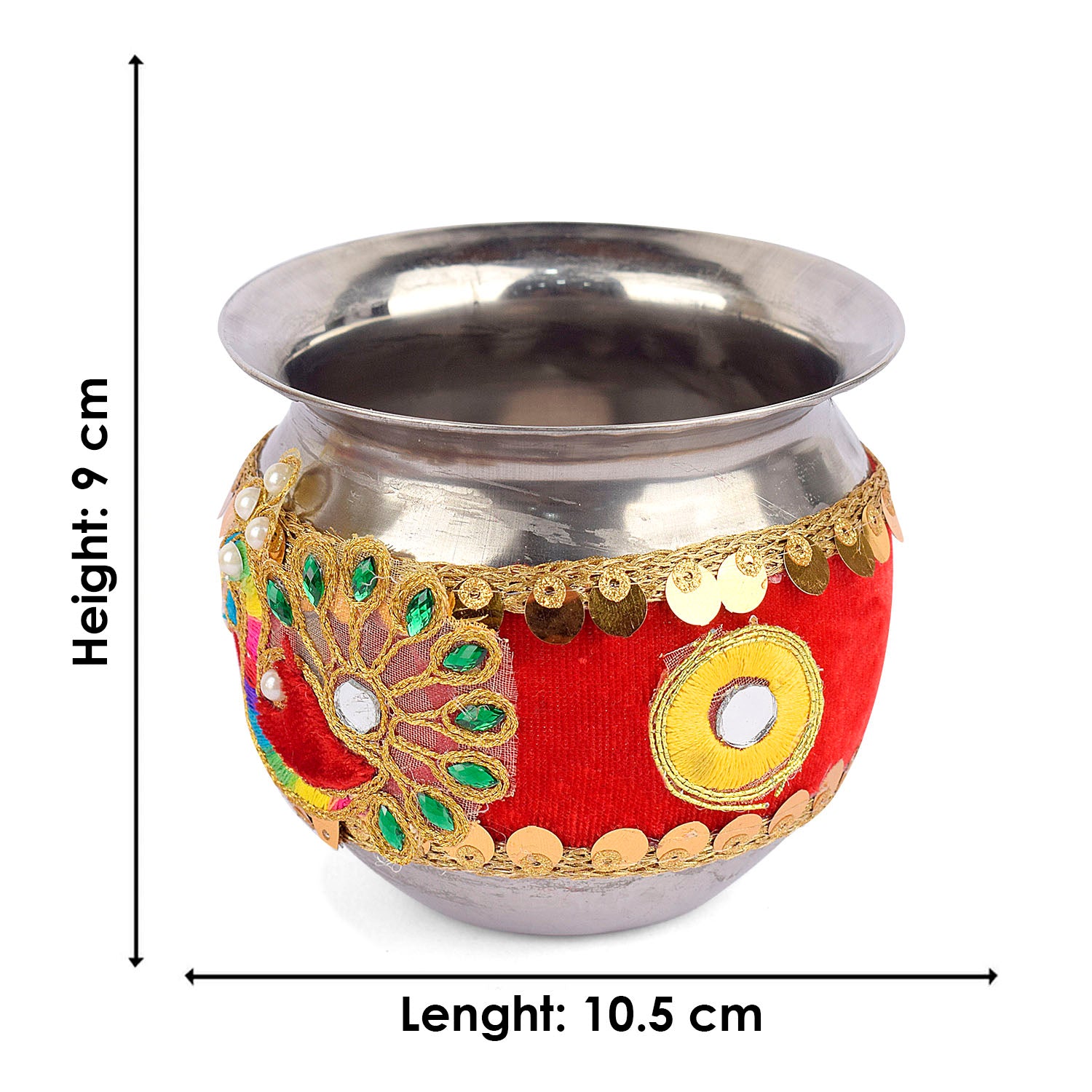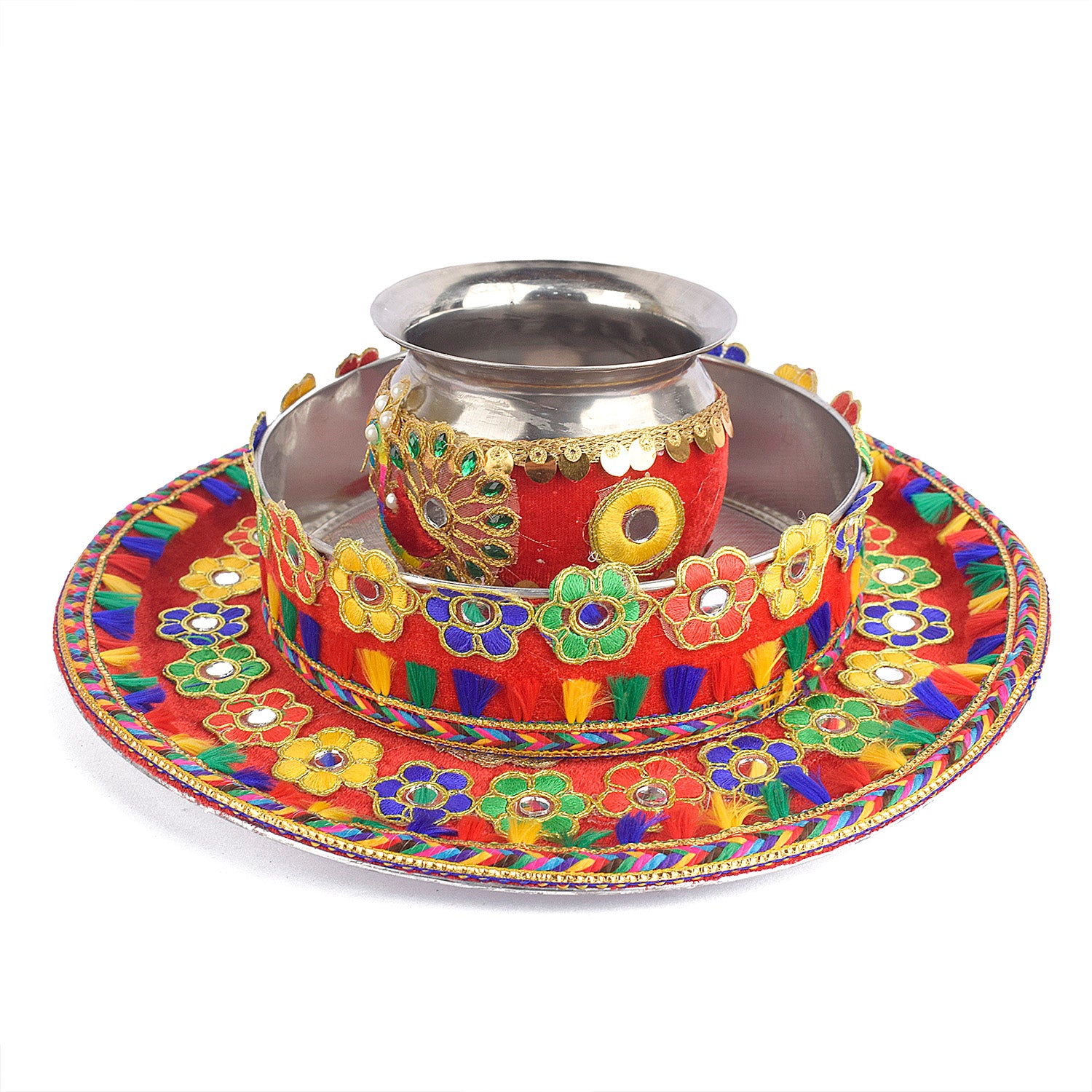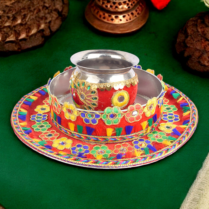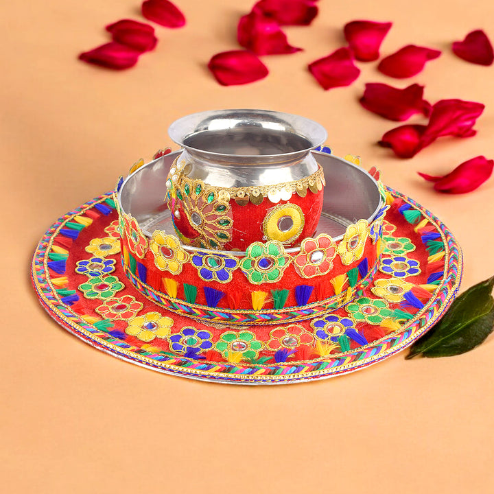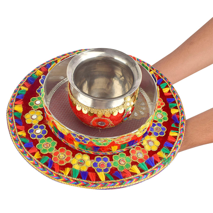 About Product:Β Karwa chauth beautiful Steel thali set includes a thali, Lota, Sieve for traditional and trendy way of karwa chauth pujan for all the married / engaged ladies and girls. Be attractive by using such a decorative piece of thali of puja for your love/ life. This thali can also be used on Diwali/ Deepawali Pujan. Karwa chauth thali set, karwa chauth thali, karwachauth thali platter, karvachauth thali platter, pooja thali set, steel puja thali set, complete karwachauth set, karwachouth set, designer thali set,hanmade thali set, Indian traditional set, karwachauth thali.