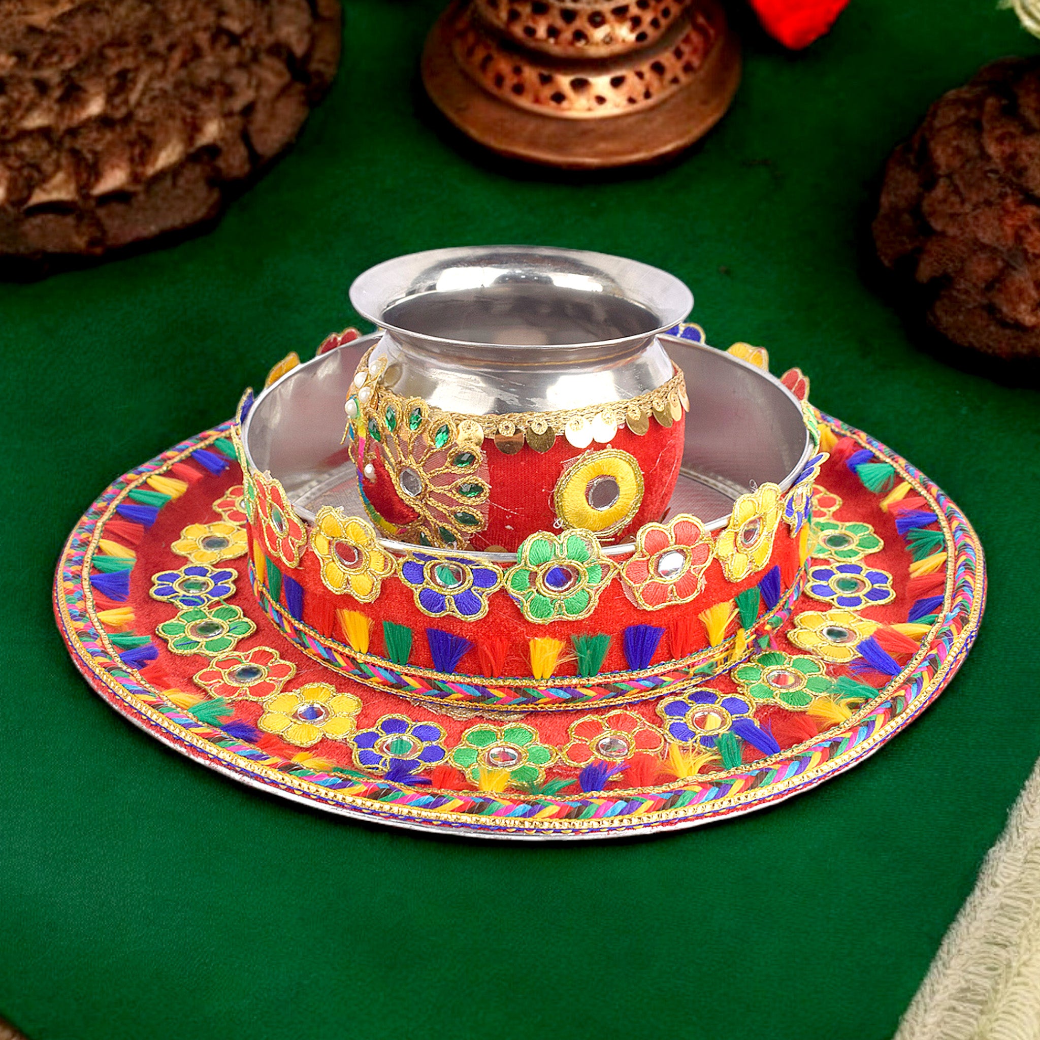 Karwa Chauth Handmade Floral Thali Set - 3pc|satvikstore.in