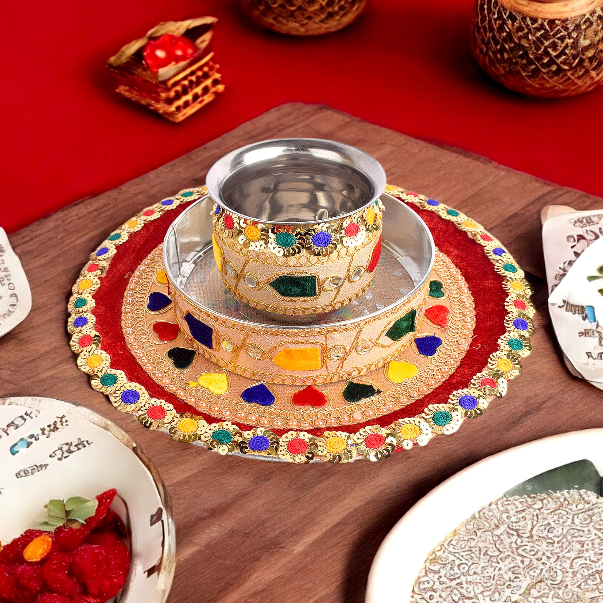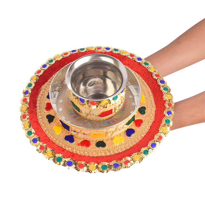 Radiant Multicolor Karwa Chauth Thali Set- 3pc|satvikstore.in