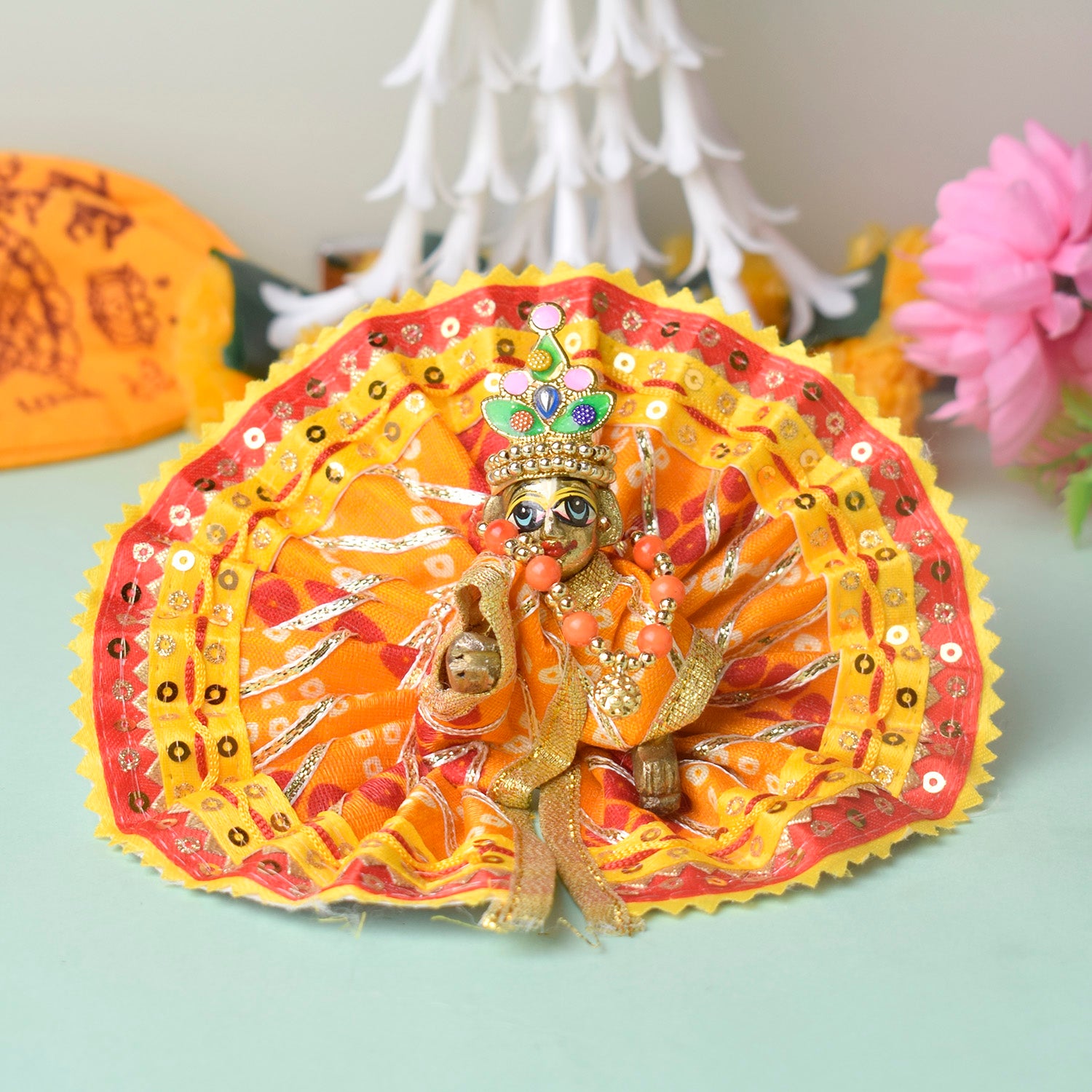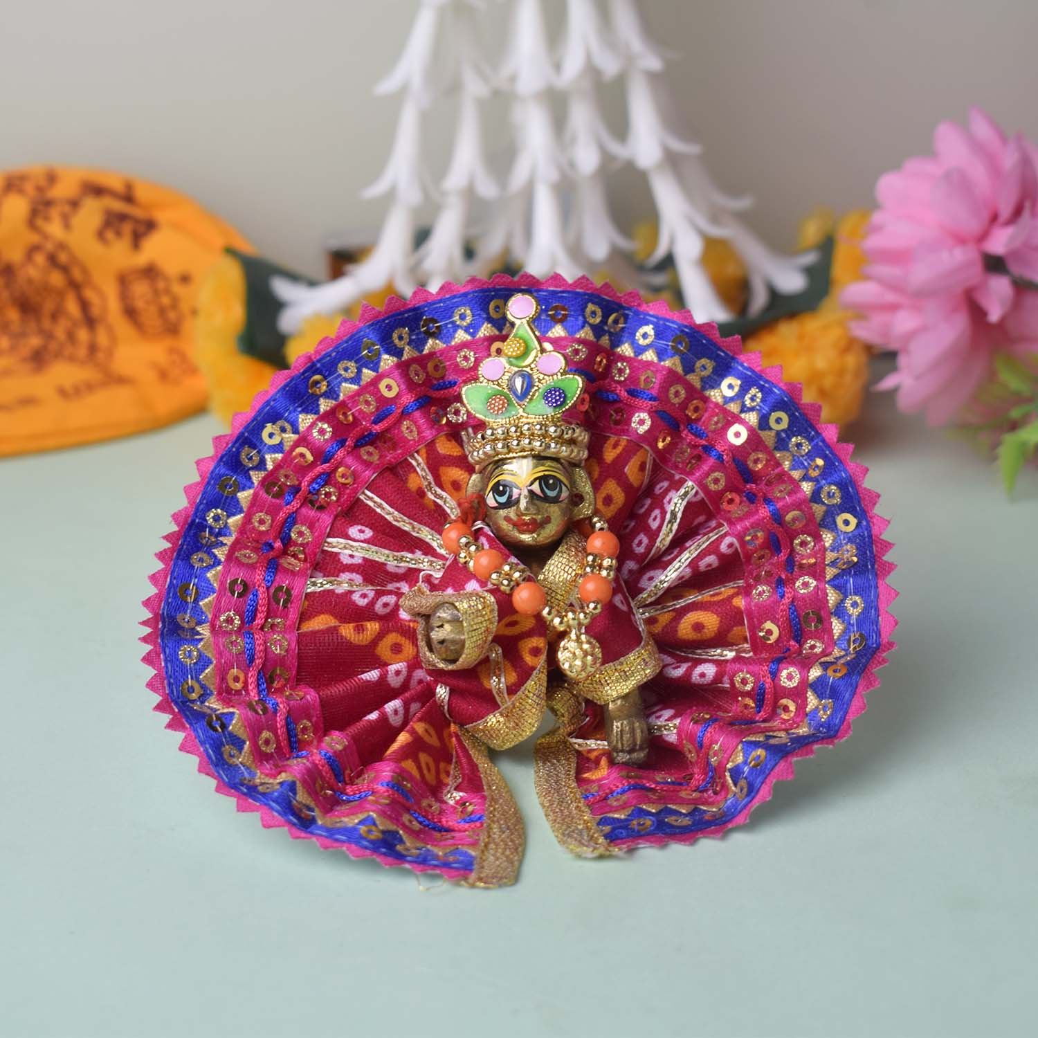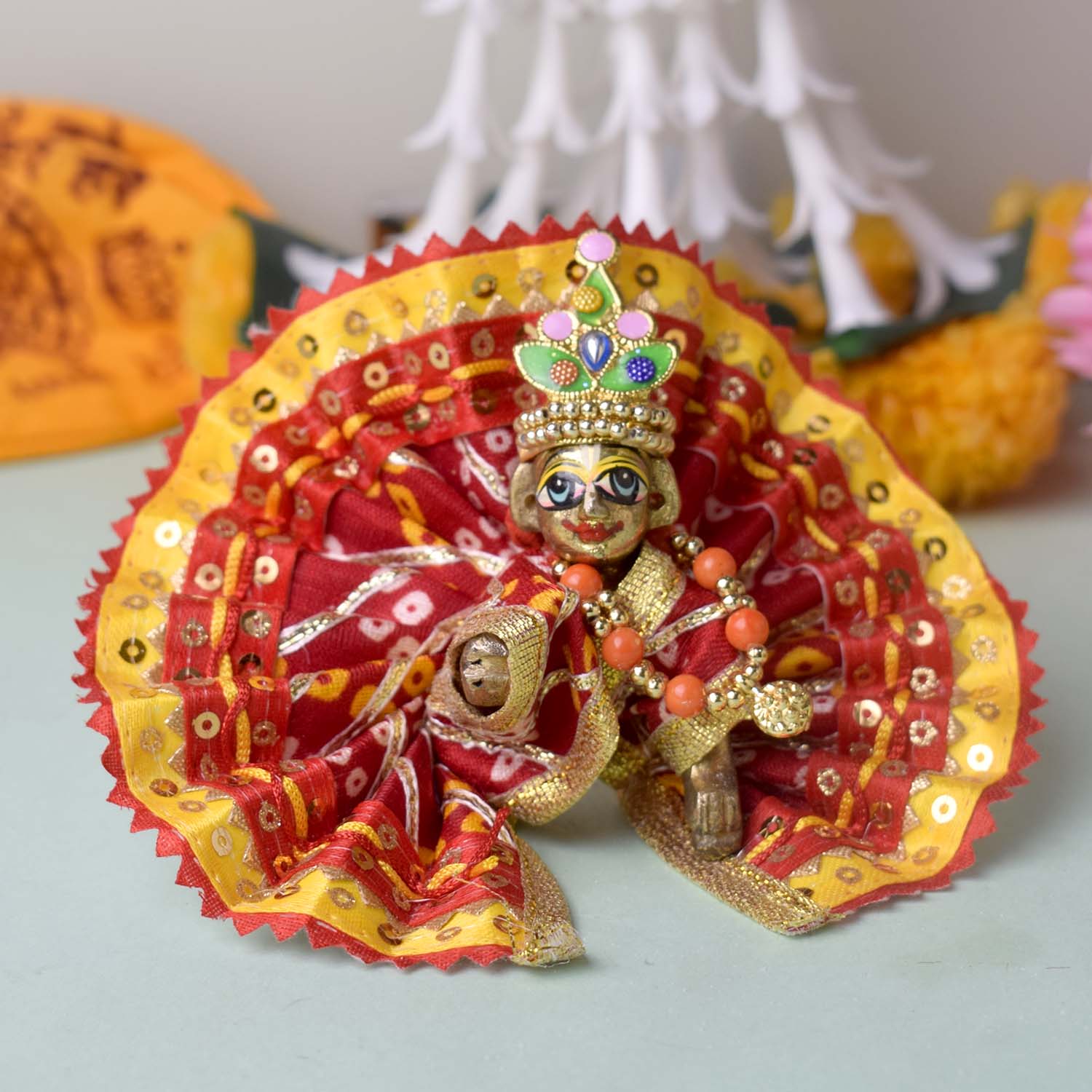 Expertly crafted for a perfect fit, this dress comes in sizes 1 and 2, and is available in stunning shades of red, yellow, pink, orange, green, and blue. Wrap your divine Laddu Gopal in the splendour of Bandhani artistry and bring ethnic charm to your temple dΓ©cor.