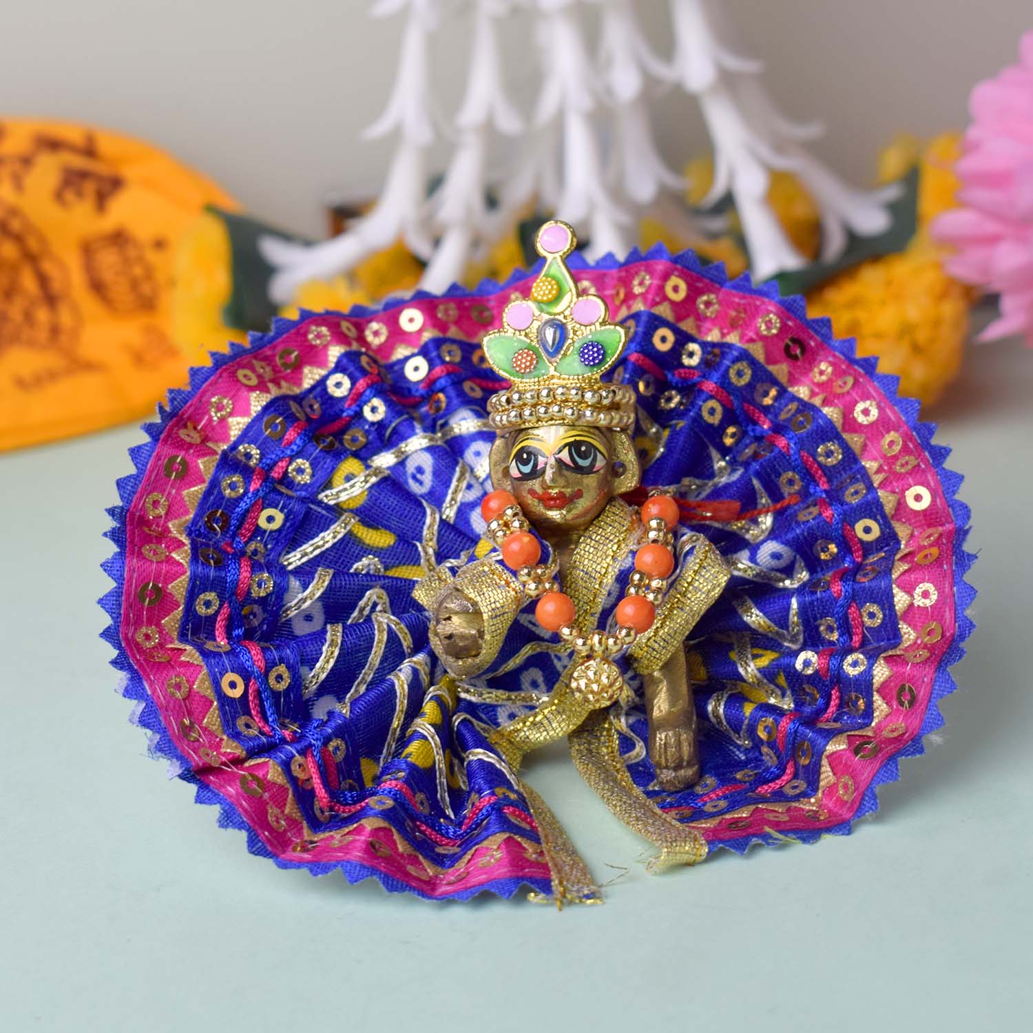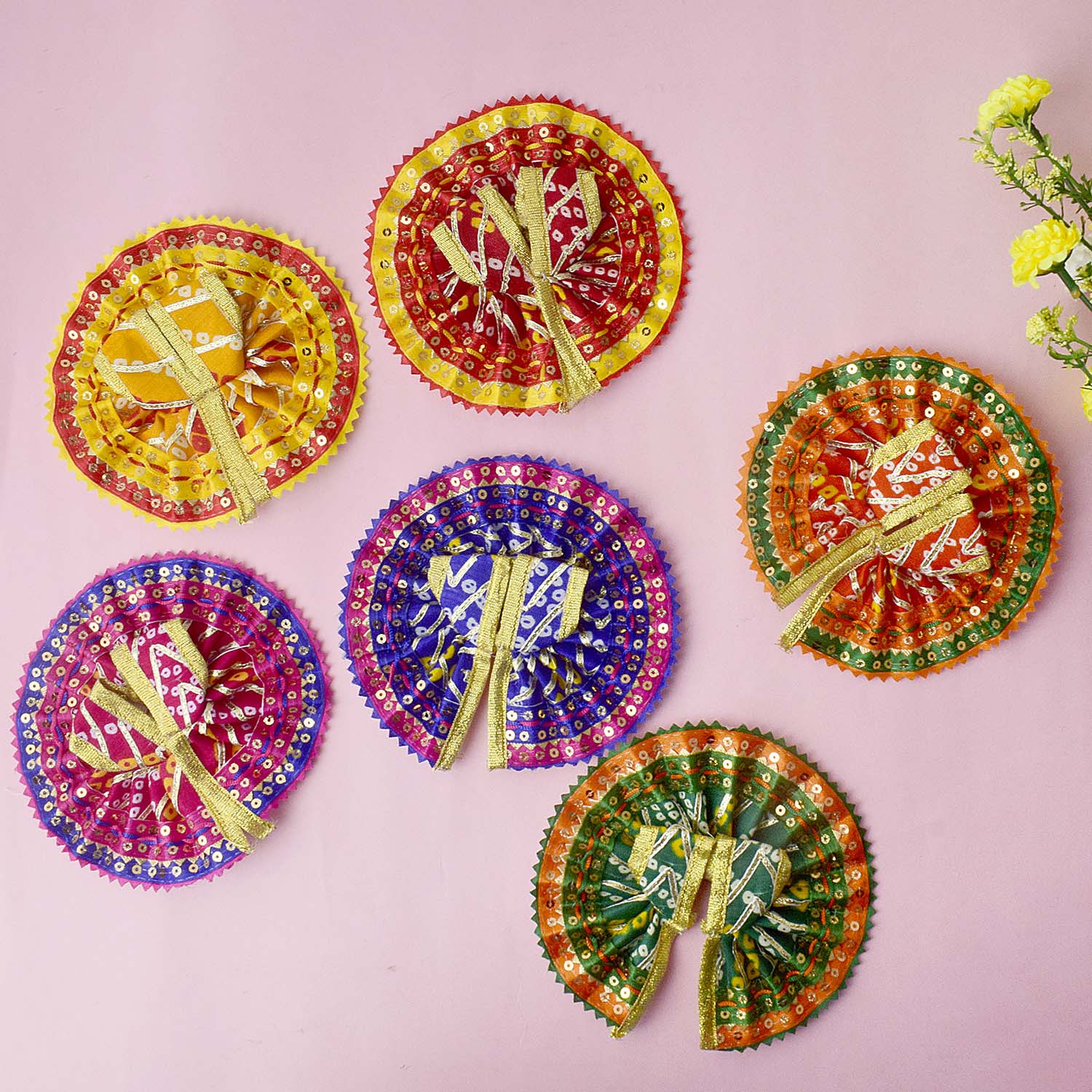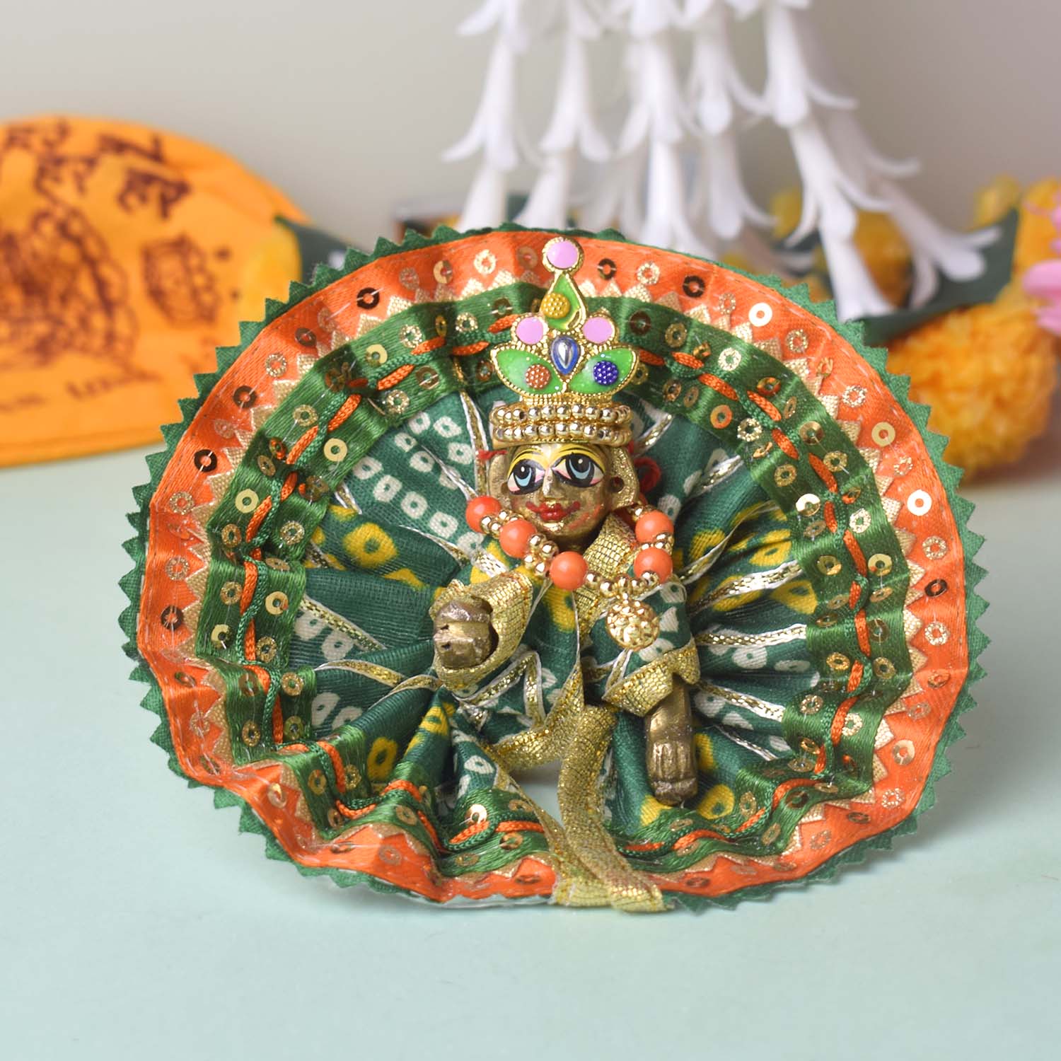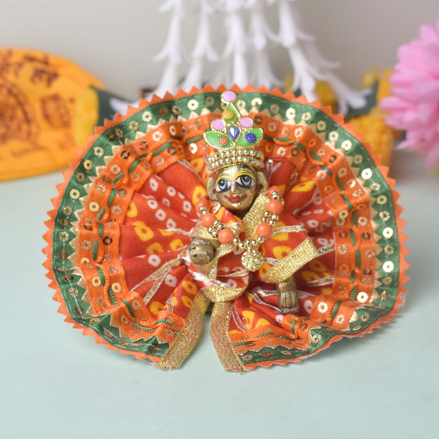 Expertly crafted for a perfect fit, this dress comes in sizes 1 and 2, and is available in stunning shades of red, yellow, pink, orange, green, and blue. Wrap your divine Laddu Gopal in the splendour of Bandhani artistry and bring ethnic charm to your temple dΓ©cor.