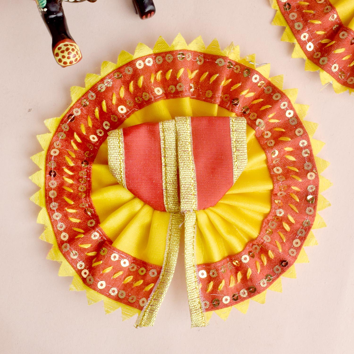 yellow red laddu gopal dress | sequin border krishna vastra | festive gopal attire | kanha ji dress with sequins | pooja gopal dress | bal gopal traditional clothes | handmade laddu gopal vastra | vibrant krishna dress | janmashtami special dress | elegant pooja wear | temple deity clothes | bal gopal poshak