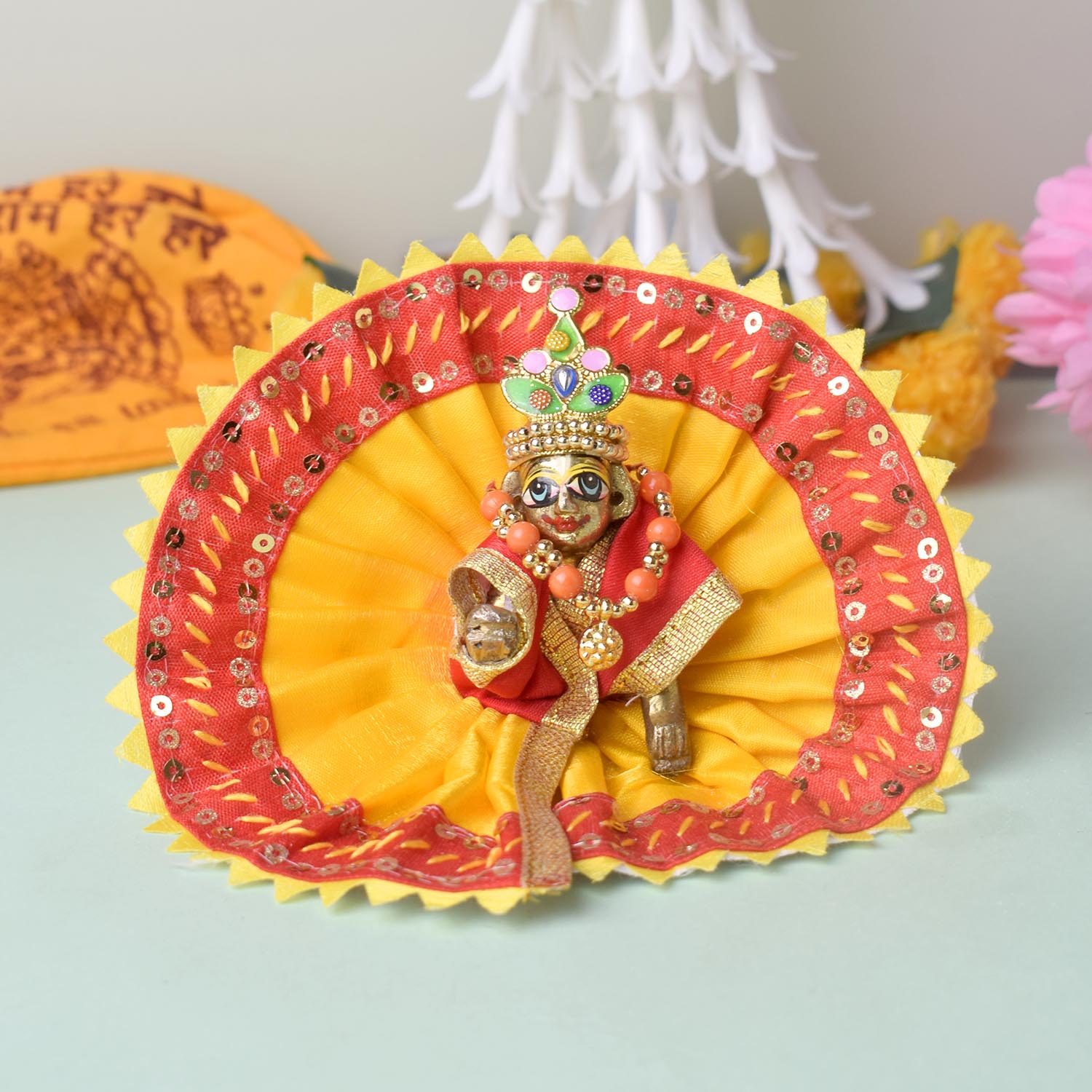 Give your Laddu Gopal a sparkling touch of elegance with this radiant yellow and red dress adorned with a shimmering sequin border. Beautifully crafted from quality fabric, it showcases bright hues and dazzling details that enhance the divine charm of your deity.