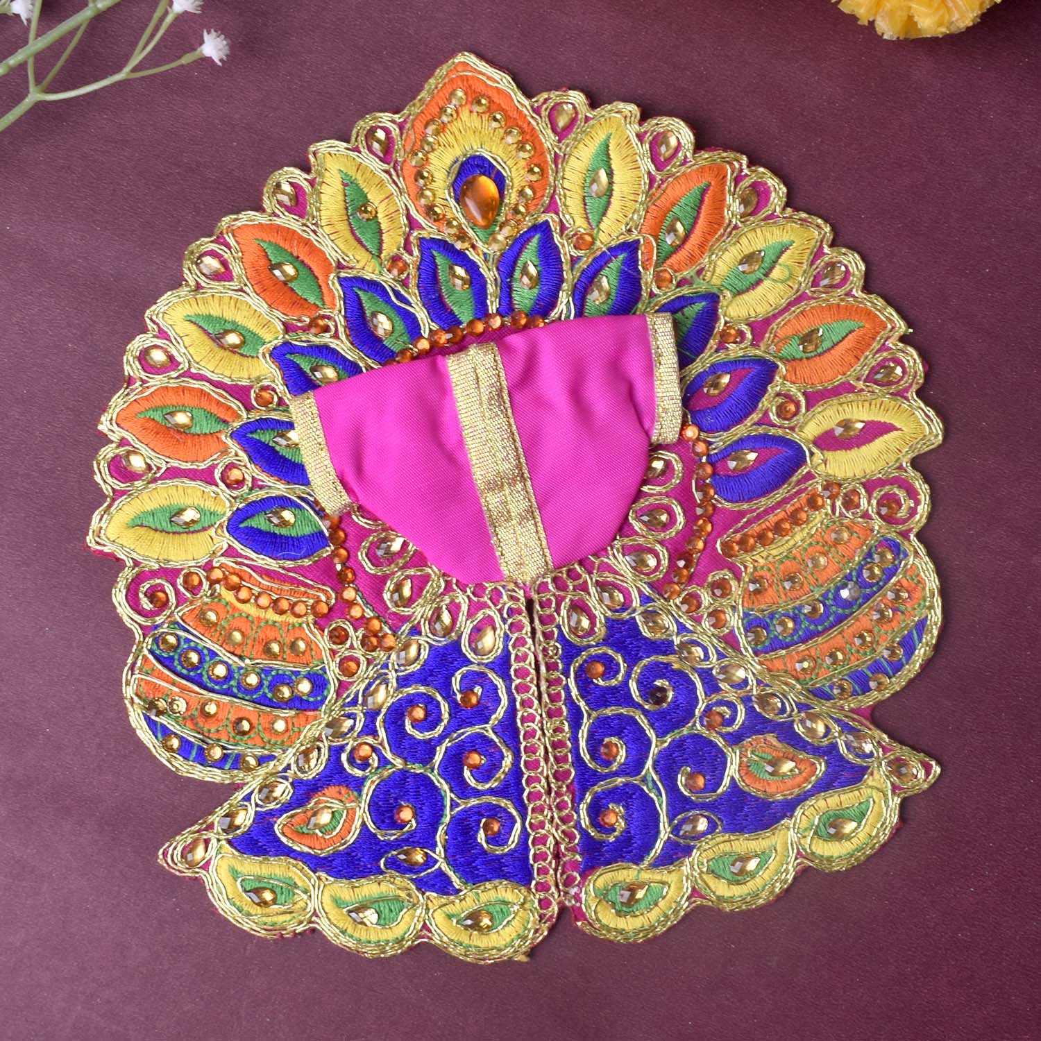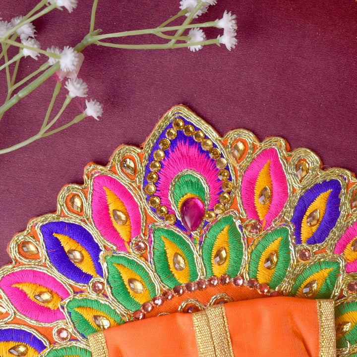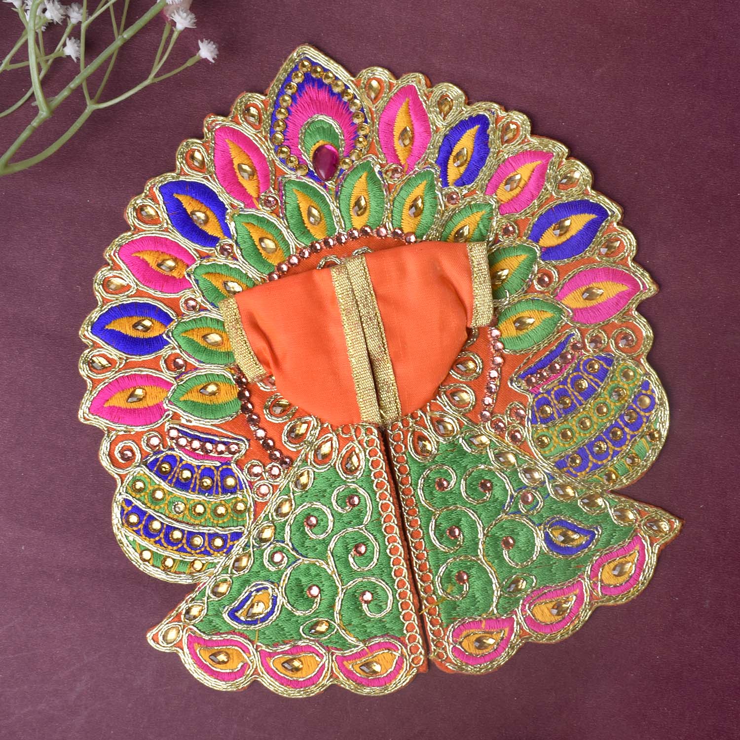 Wrap your divine Laddu Gopal in radiant elegance with this stunning dress featuring colourful matka and leaf embroidery highlighted with sparkling stonework. Each piece is a unique creation, crafted in assorted vibrant shades to add a festive glow to your pooja space.