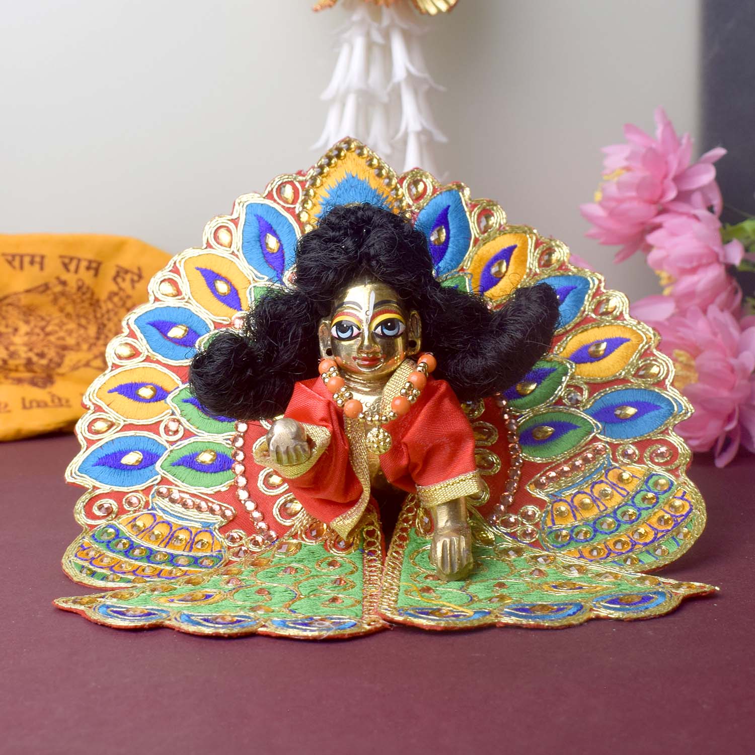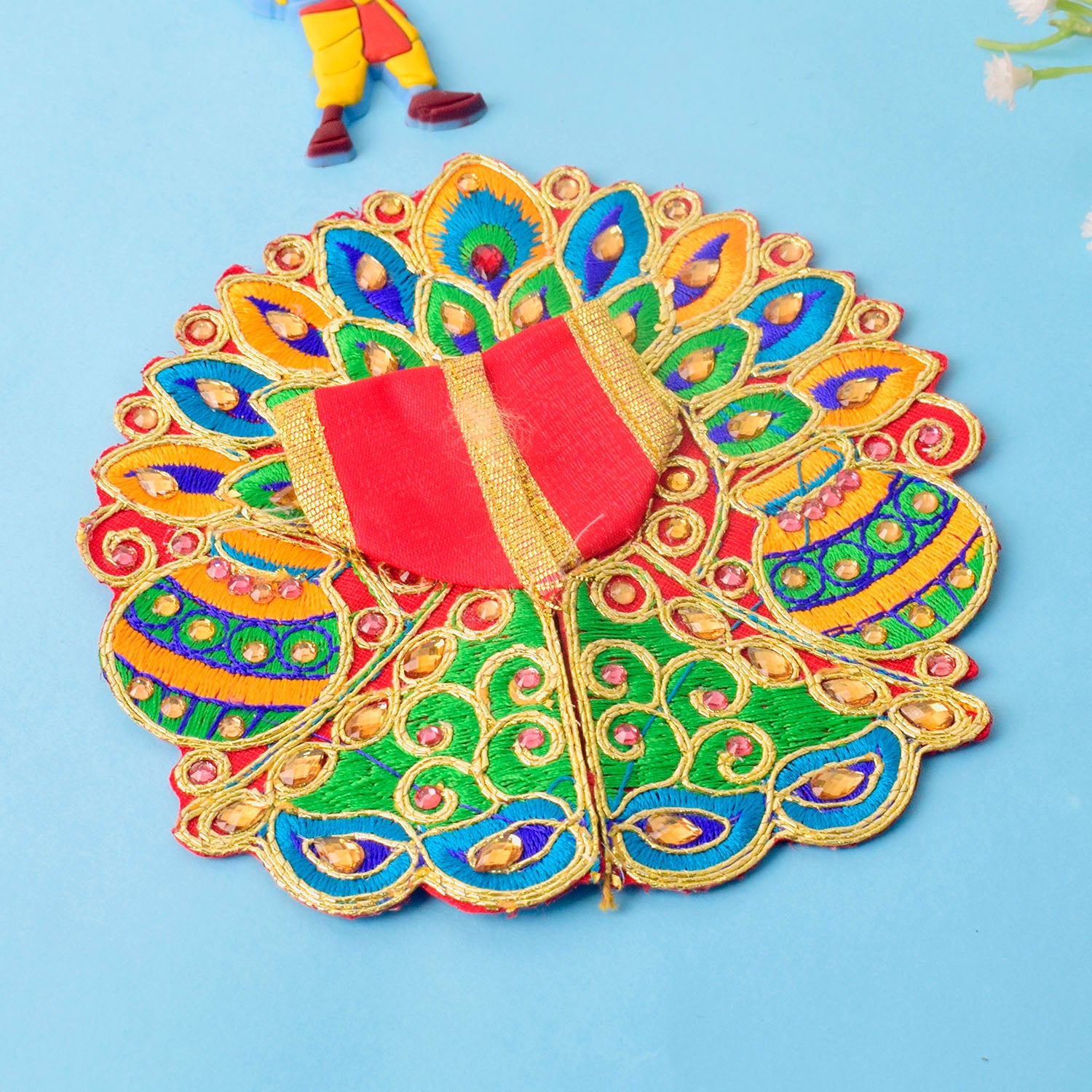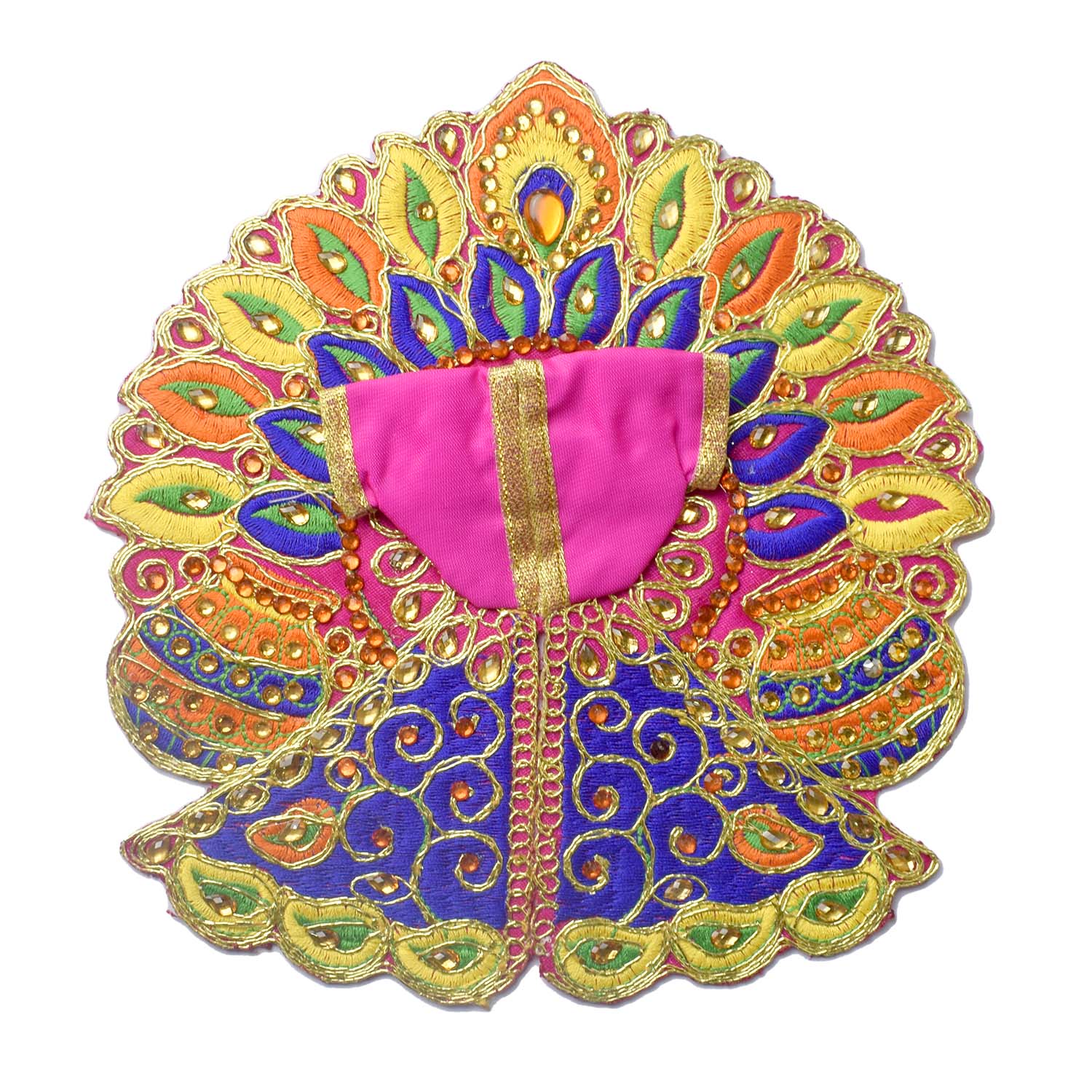 Wrap your divine Laddu Gopal in radiant elegance with this stunning dress featuring colourful matka and leaf embroidery highlighted with sparkling stonework. Each piece is a unique creation, crafted in assorted vibrant shades to add a festive glow to your pooja space.