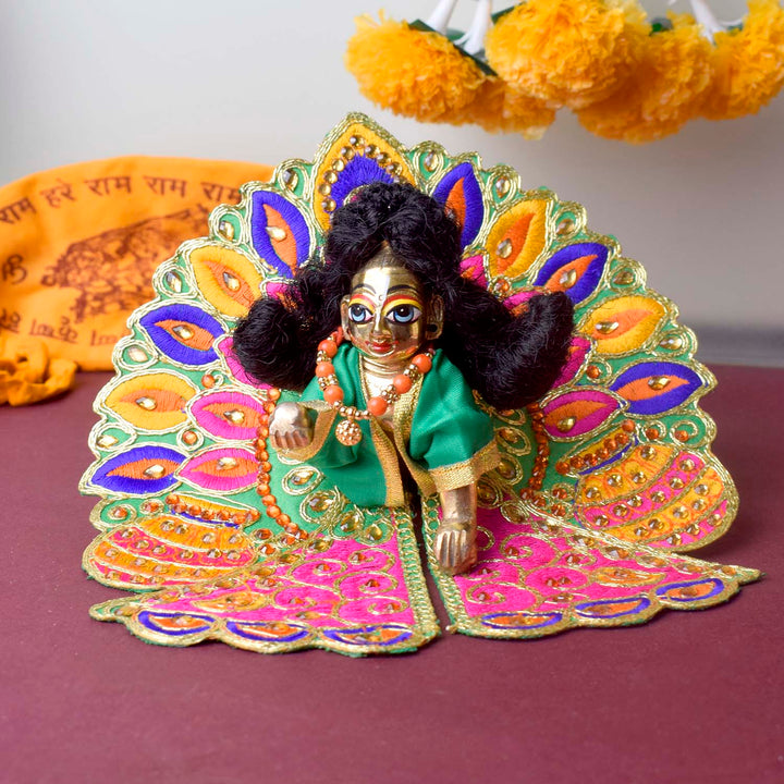 The fine embroidery and glistening stones infuse the outfit with divine charm, making it perfect for Janmashtami, special poojas, or daily darshan. Available in sizes 1, 2, 4, 5, and 6, this exquisite poshak elevates your deity’s look with traditional artistry and vibrant beauty.