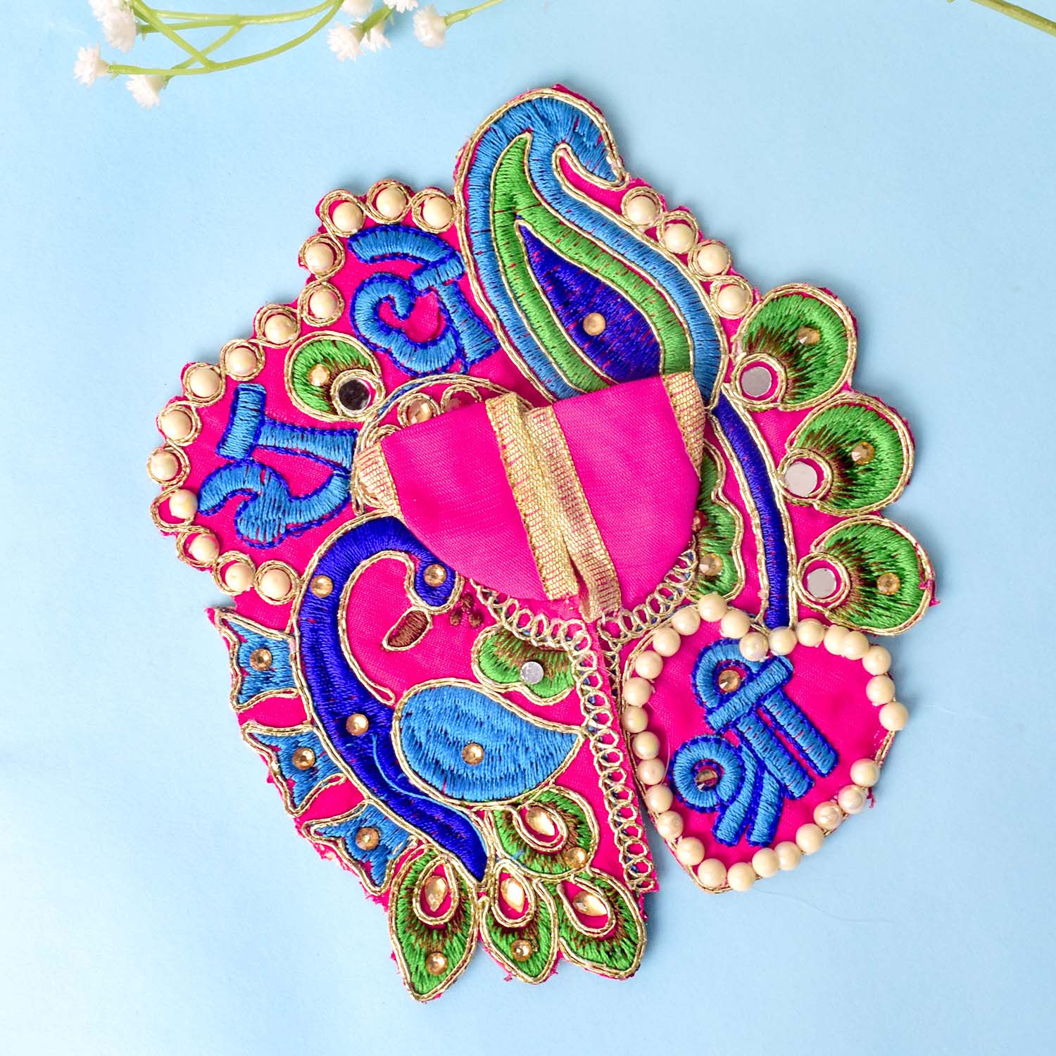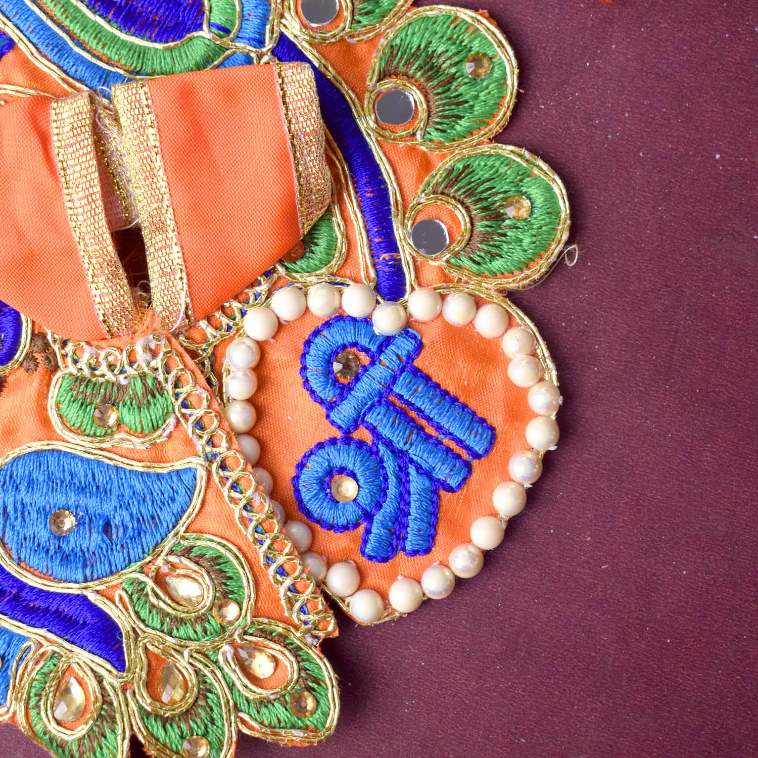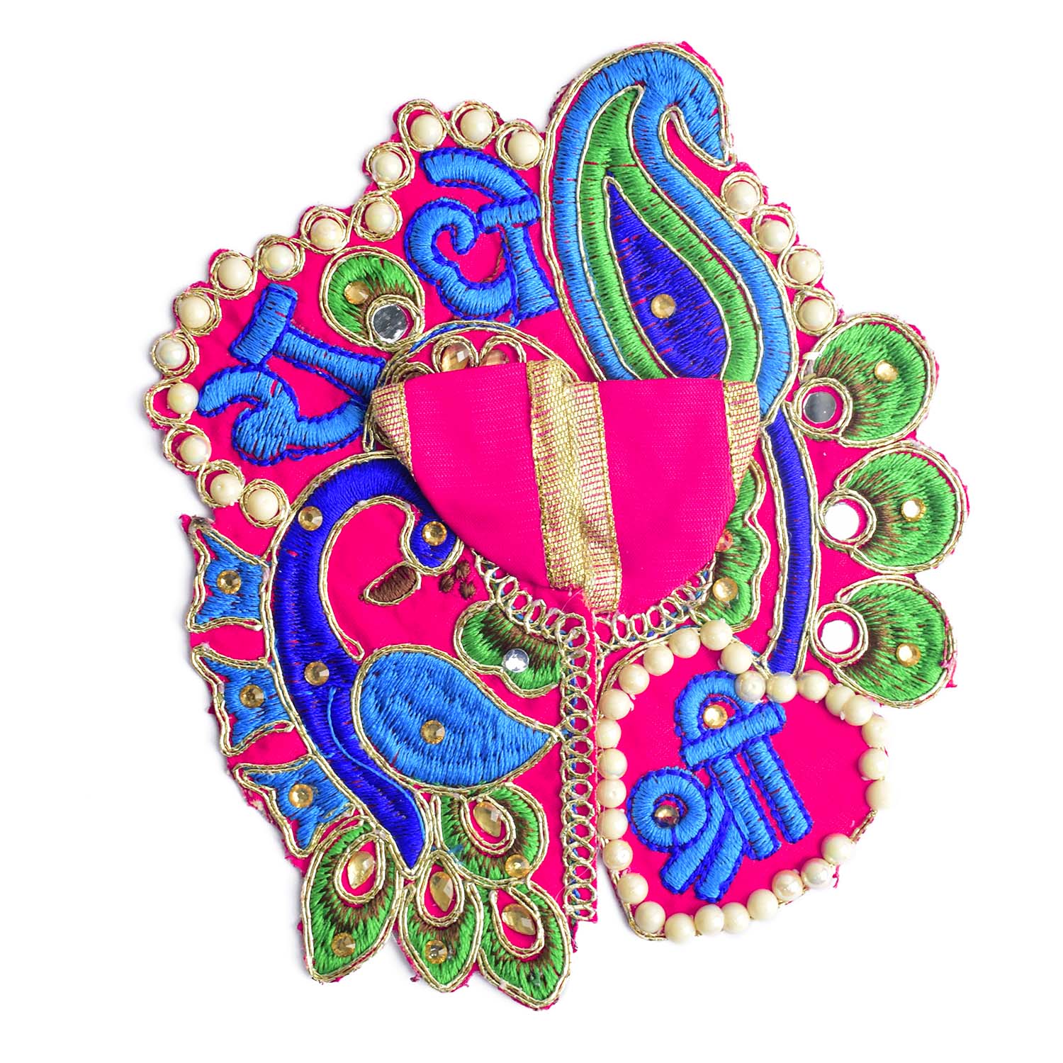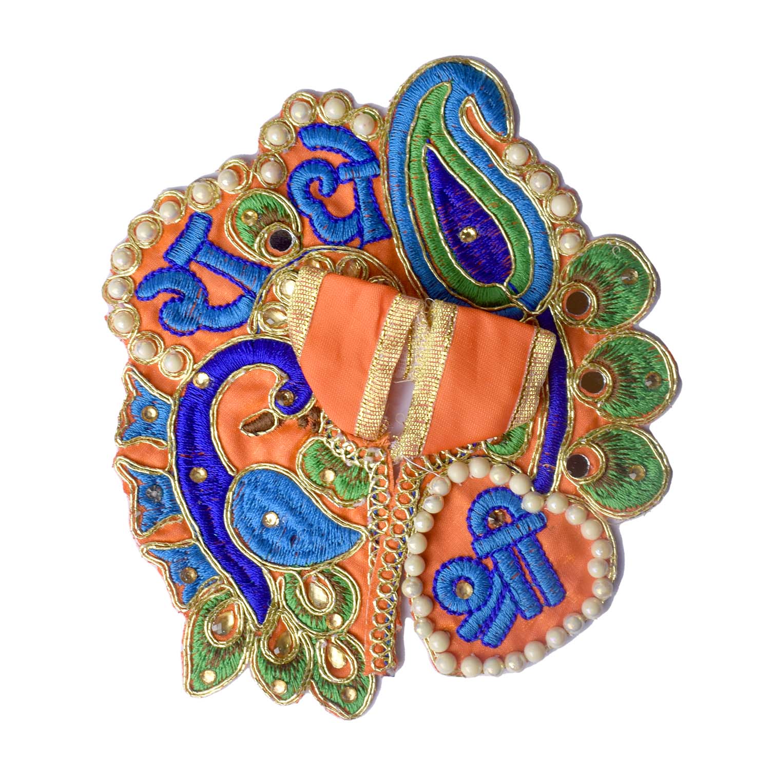 Celebrate devotion and artistry with our stunning Laddu Gopal dress, featuring the divine β€œShri Radhe” embroidery as its central highlight. This exquisite poshak combines detailed stonework with a graceful peacock-inspired silhouette, radiating divine charm. The sacred Shri Radhe inscription brings deeper meaning and elegance to your pooja rituals.
