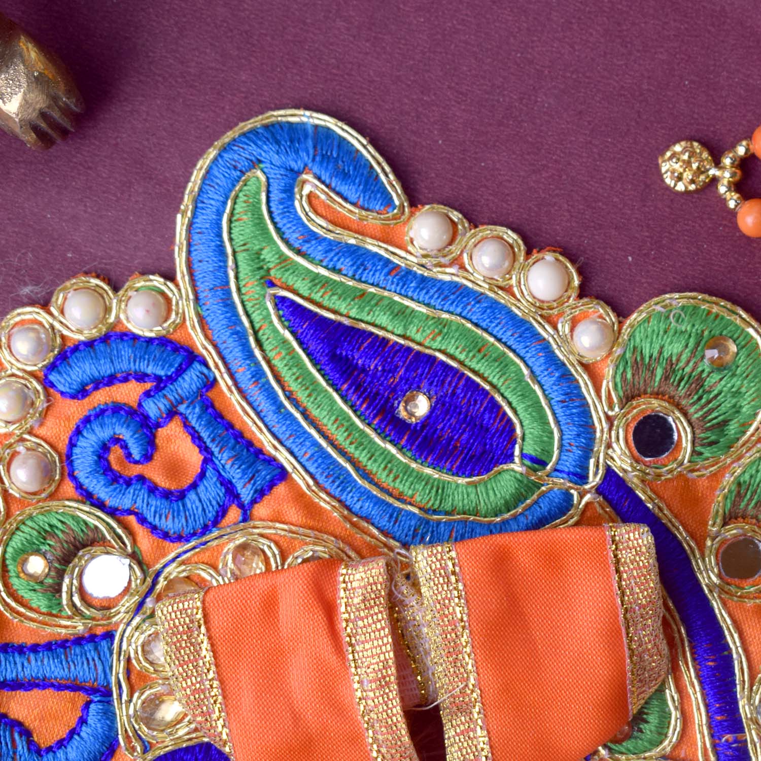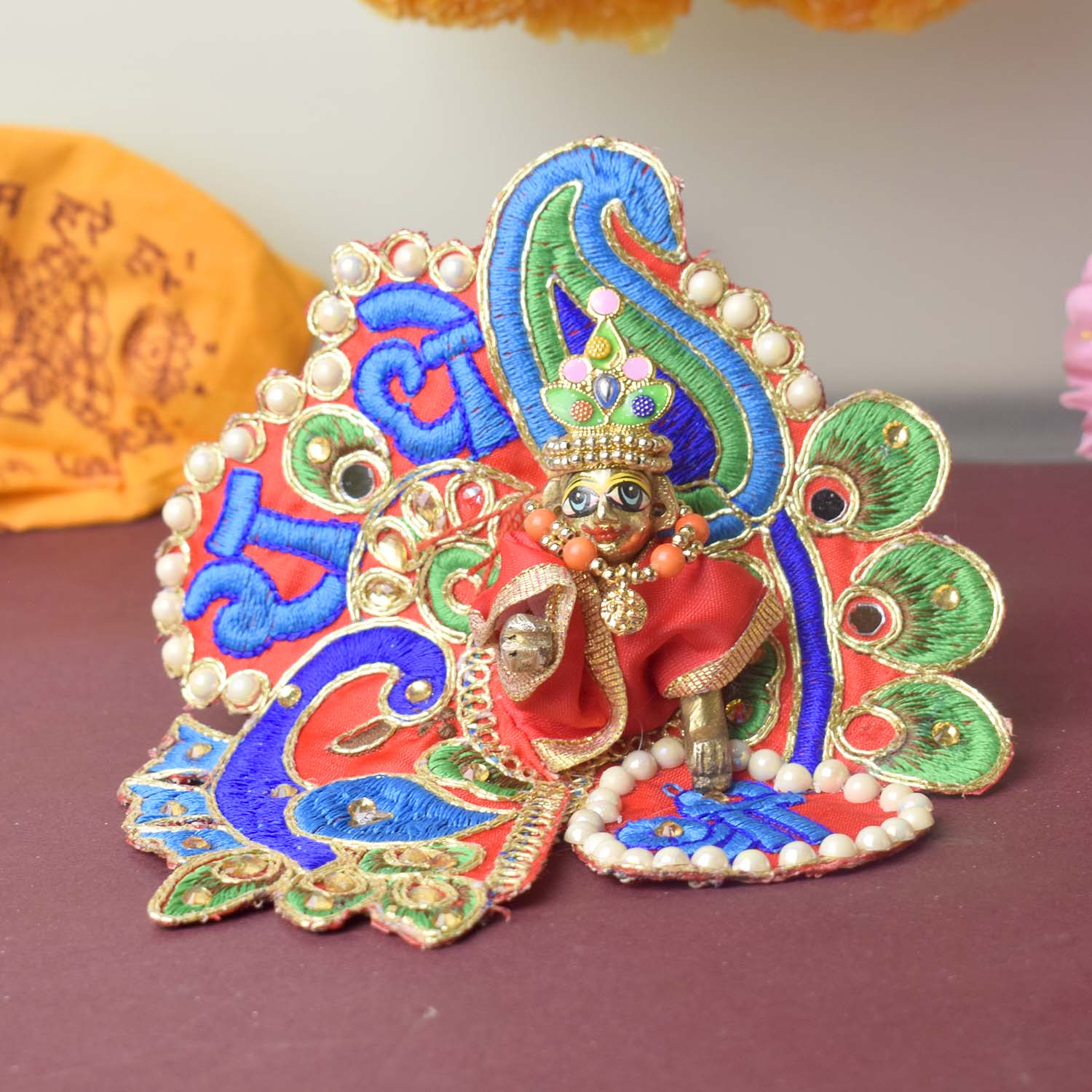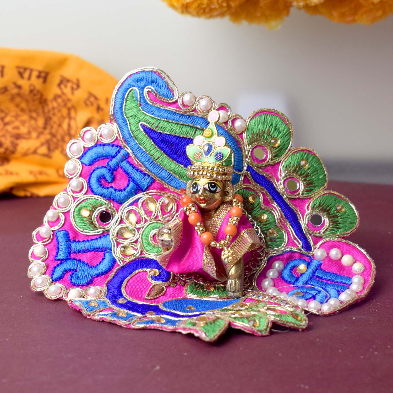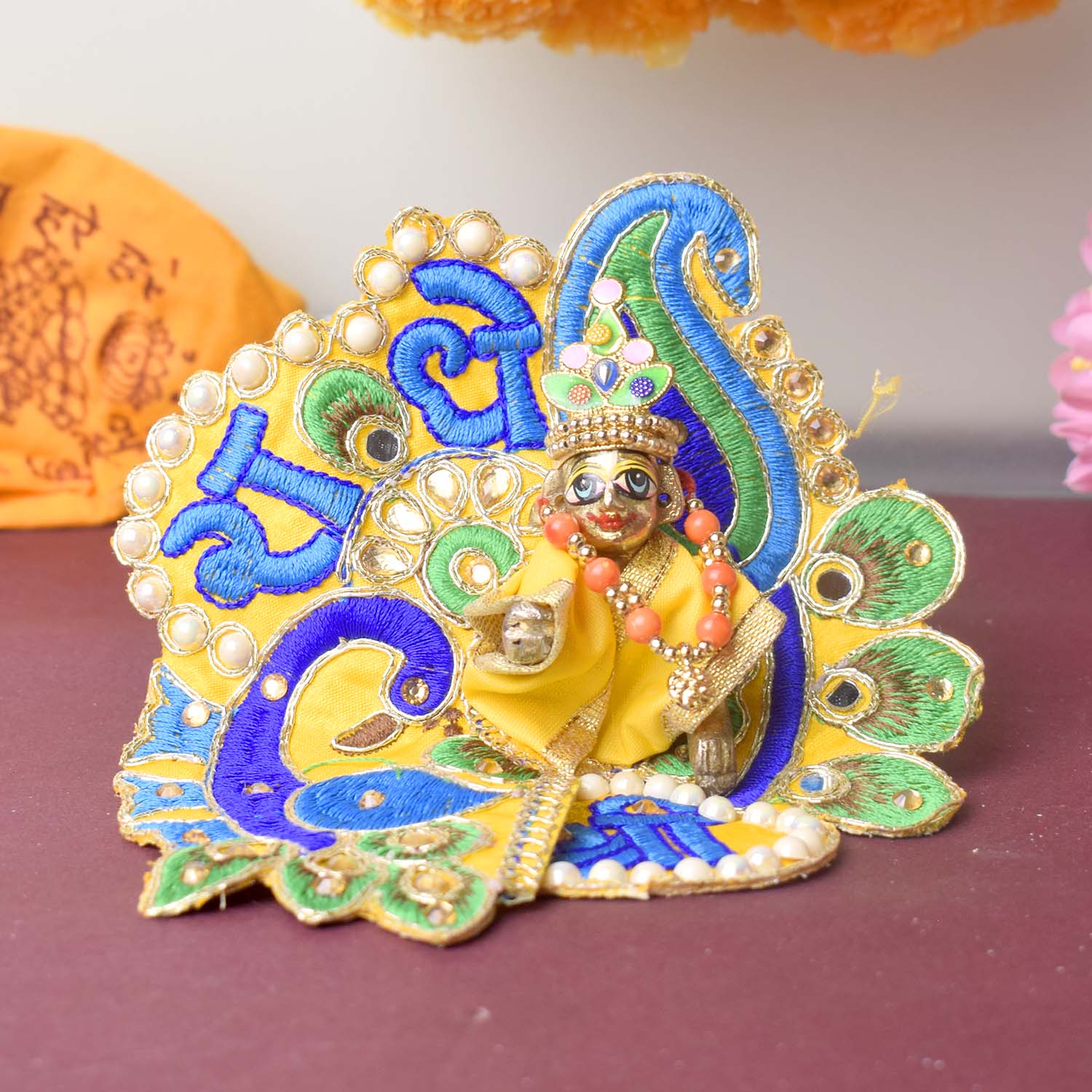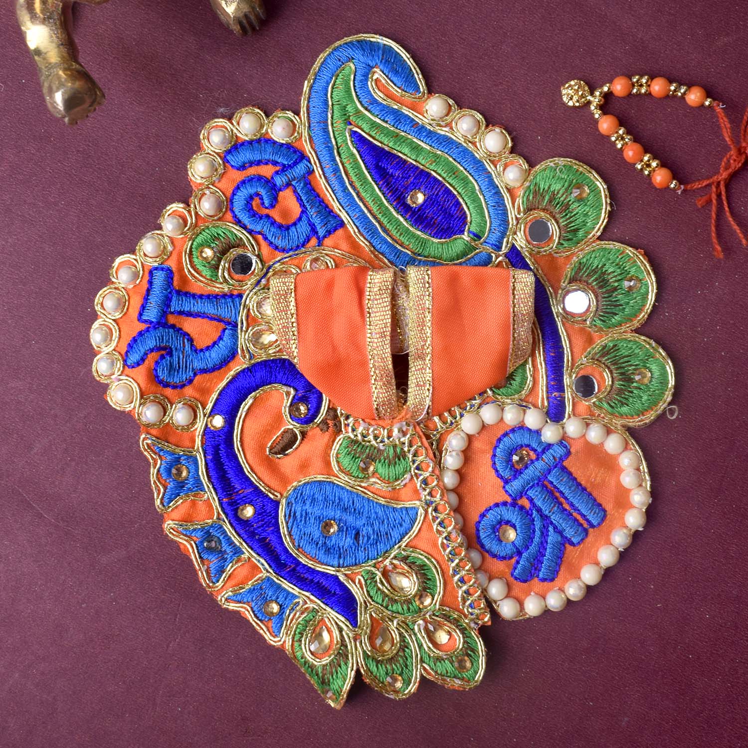 Celebrate devotion and artistry with our stunning Laddu Gopal dress, featuring the divine β€œShri Radhe” embroidery as its central highlight. This exquisite poshak combines detailed stonework with a graceful peacock-inspired silhouette, radiating divine charm. The sacred Shri Radhe inscription brings deeper meaning and elegance to your pooja rituals.