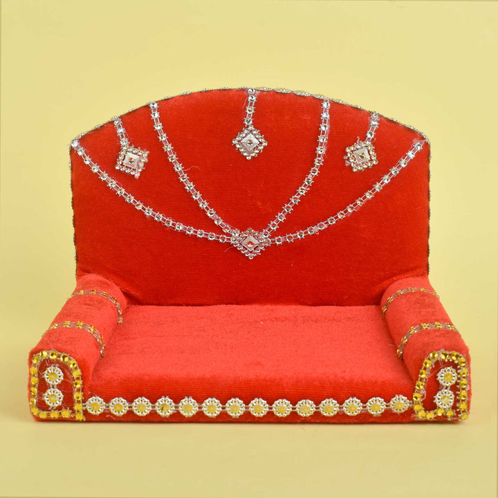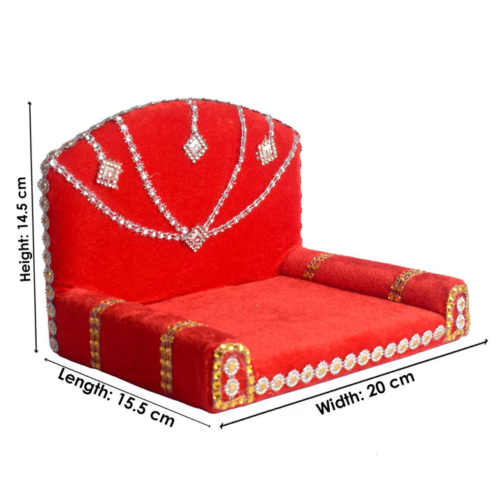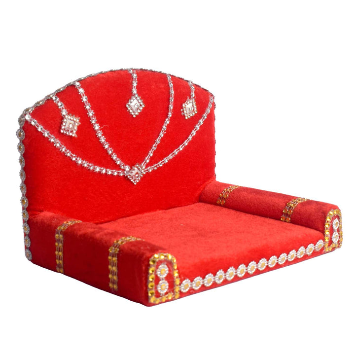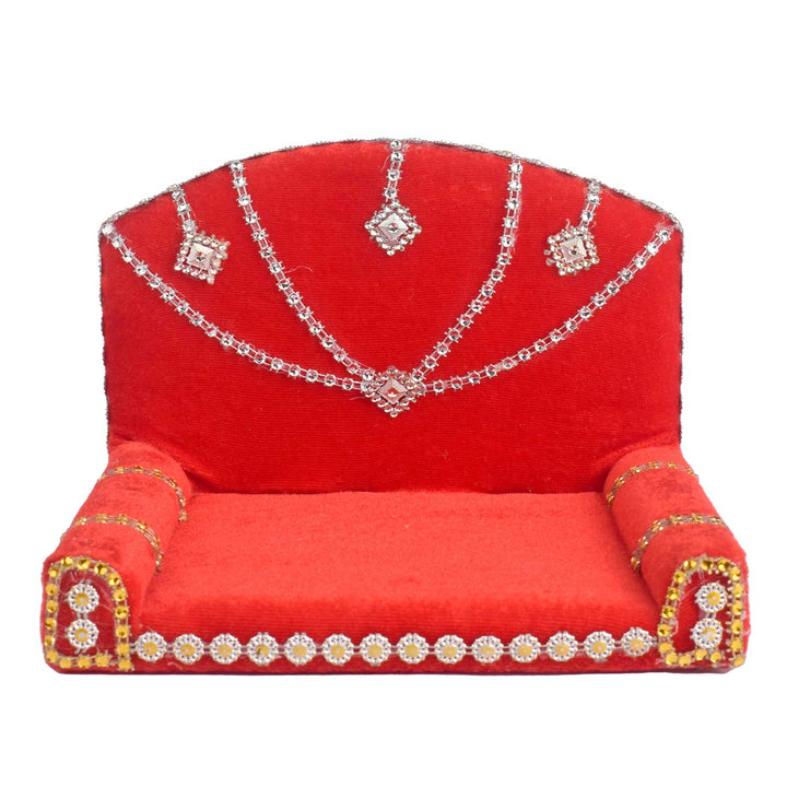 Adorn your pooja space with this vibrant Red Velvet Singhasan for Laddu Gopal, designed with rich silver detailing to reflect divine elegance. The luxurious velvet base offers a soft seat for your beloved deity, while the embellished silver work around the edges adds a majestic touch.