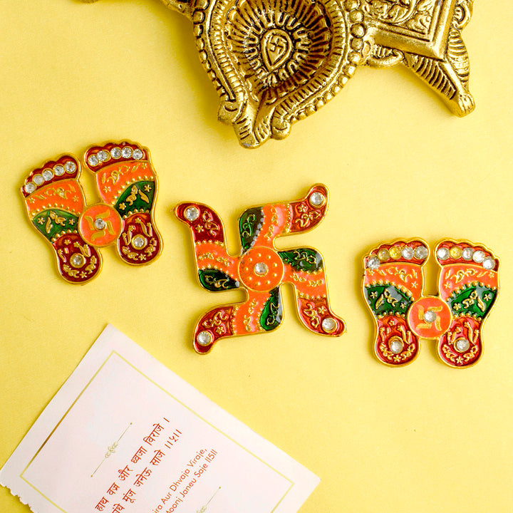 For those who appreciate the simplicity of tealights and candles, SatvikStore.in offers an array of options, each exuding a unique charm. Decorating your home becomes a spiritual journey with Laxmi Charan and Swastik stickers, ensuring that auspiciousness permeates every corner.