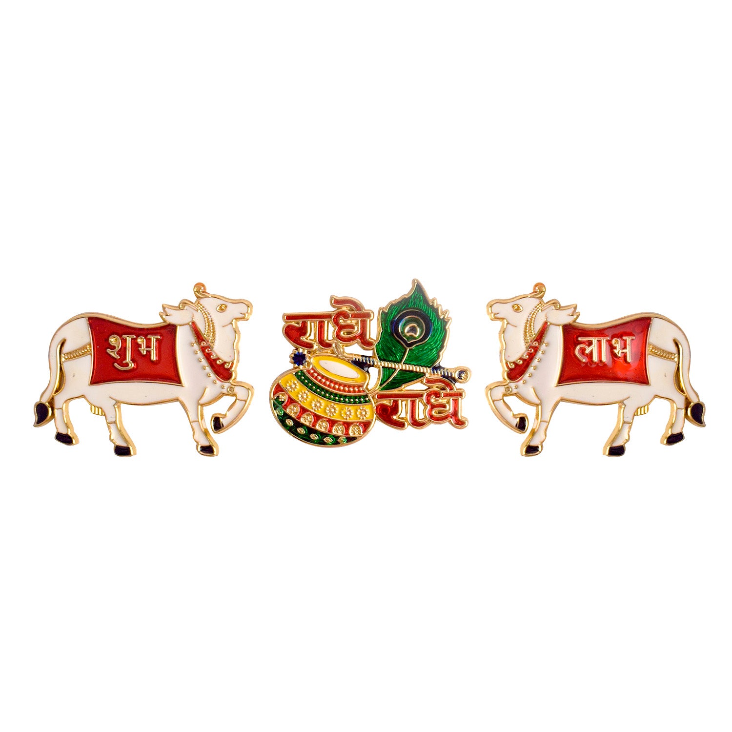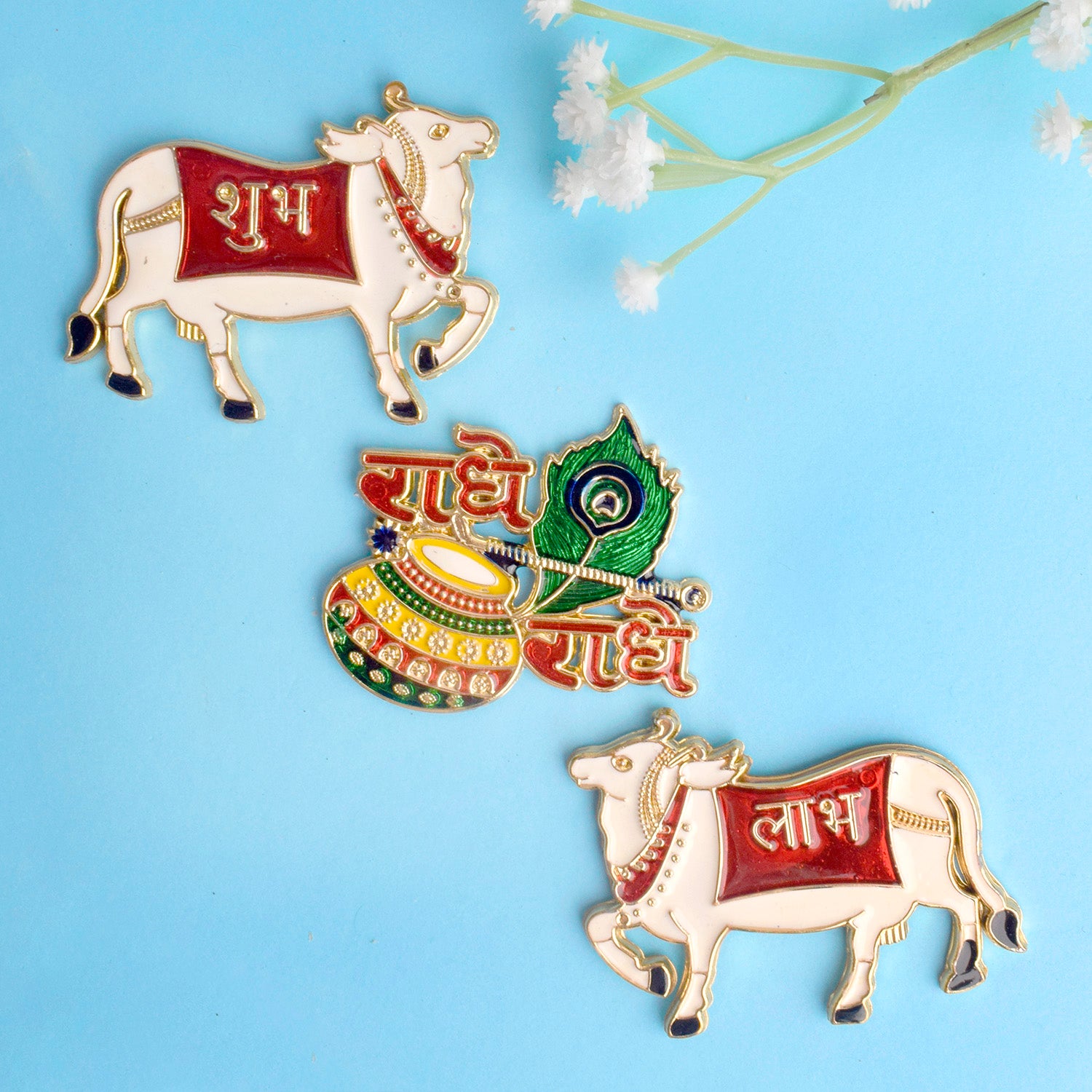 Shubh Labh Leaf With Swastik Wooden StickerPackage Contains:Β 1 Pair of Cow Stickers and 1 Handhi StickerΒ