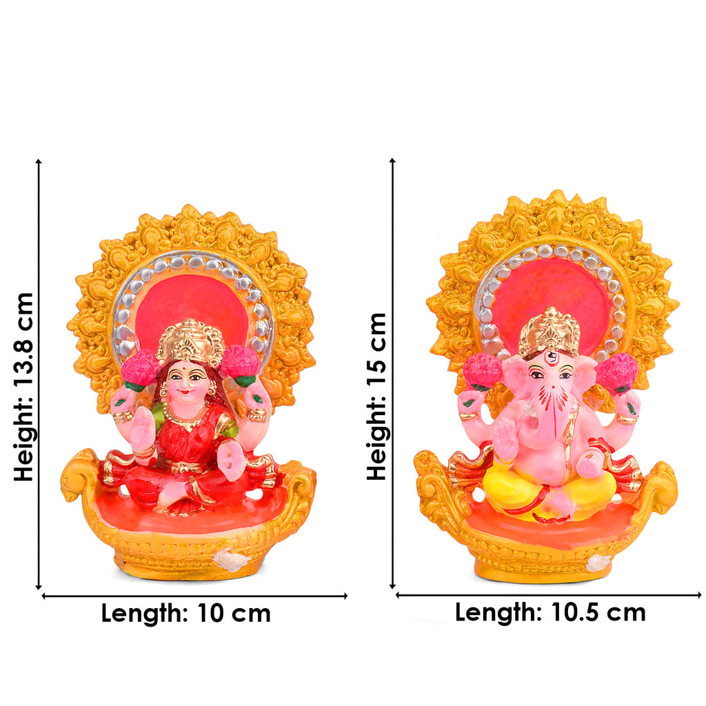 • Product Details: Material: Clay Dimensions: Ganesha: Height: 15cm, Length: 10.5cm, Width: 7.62cm, Laxmi: Height: 13.8cm, Length: 10cm, Width: 7.62cm, Total weight: 710gram, Finish Type: Glossy.
