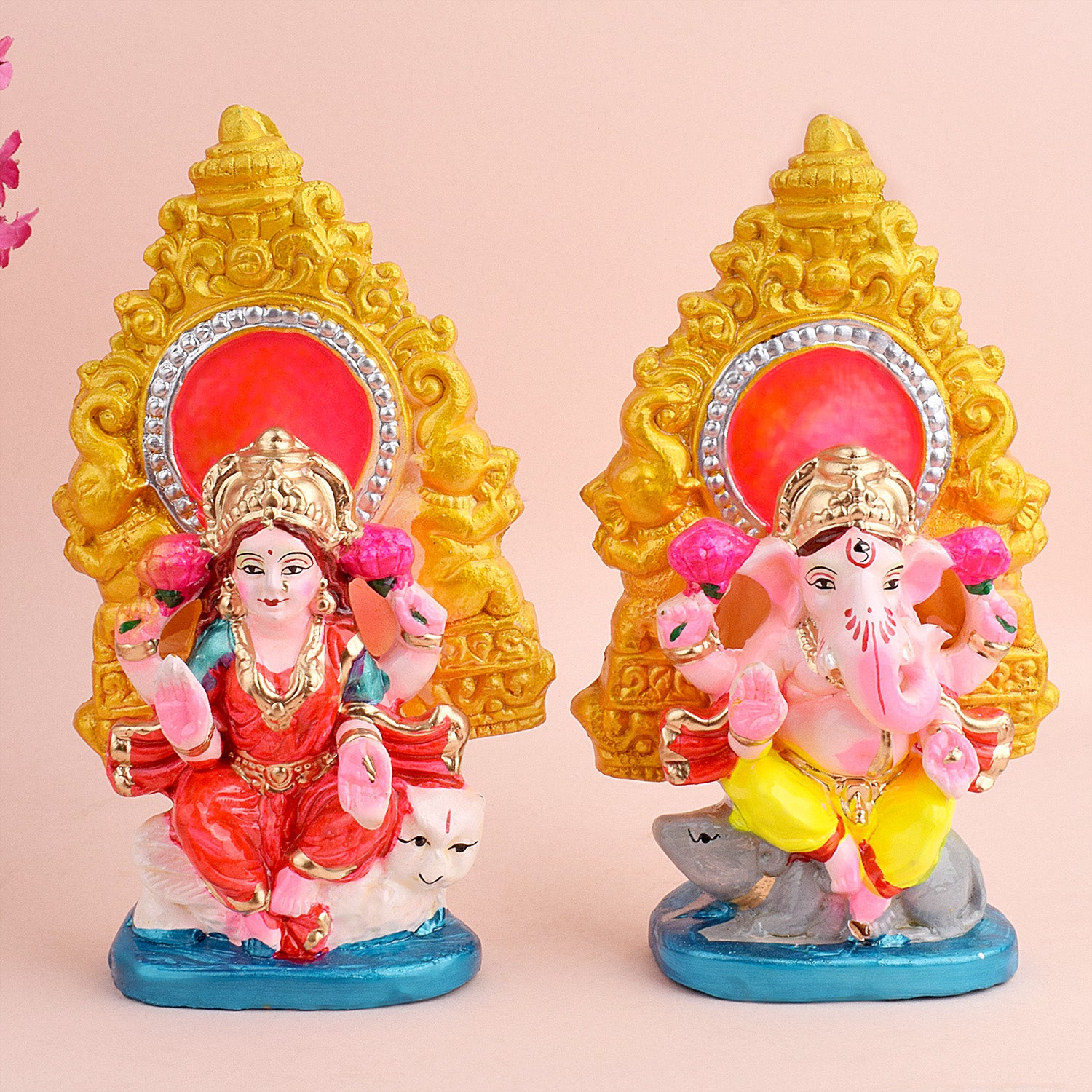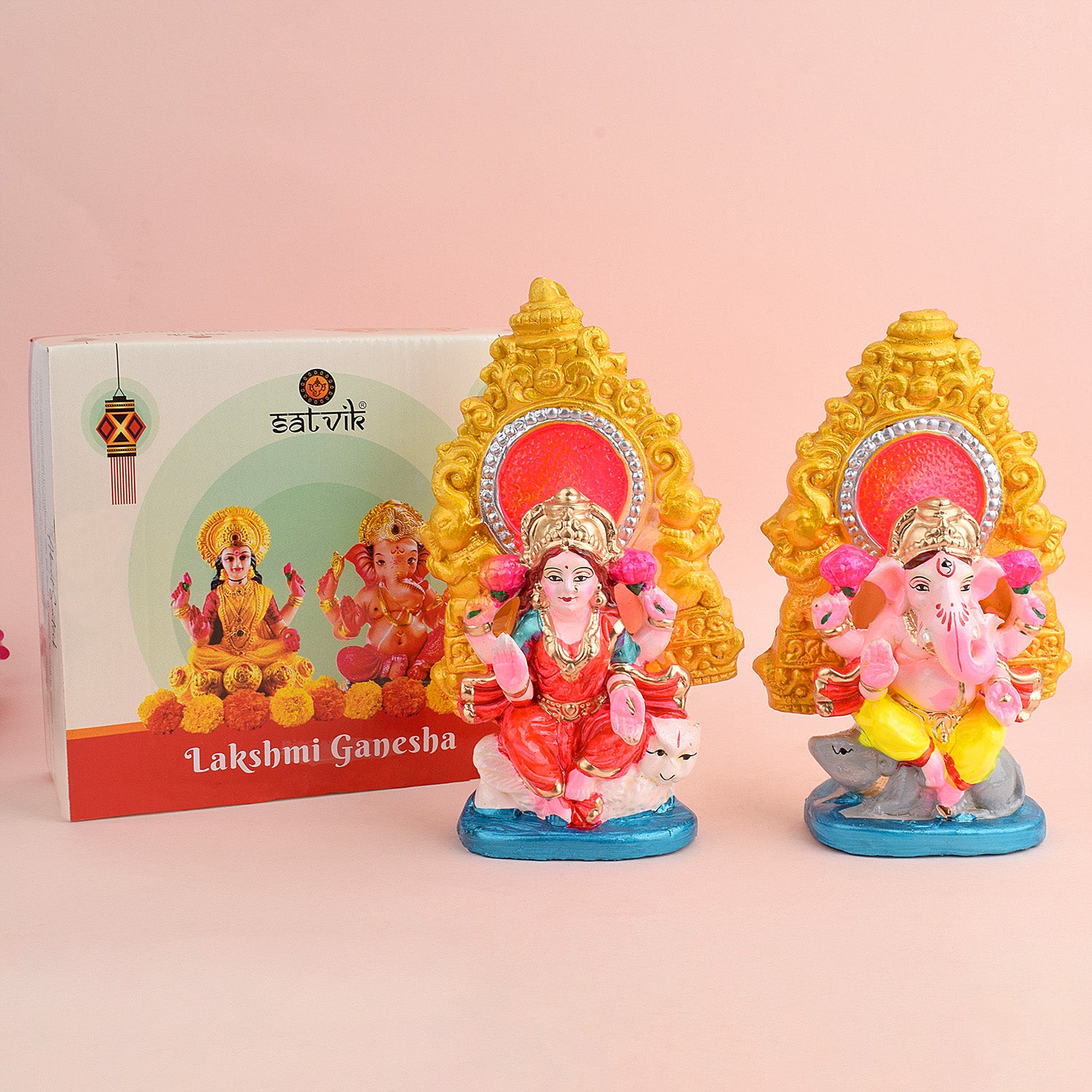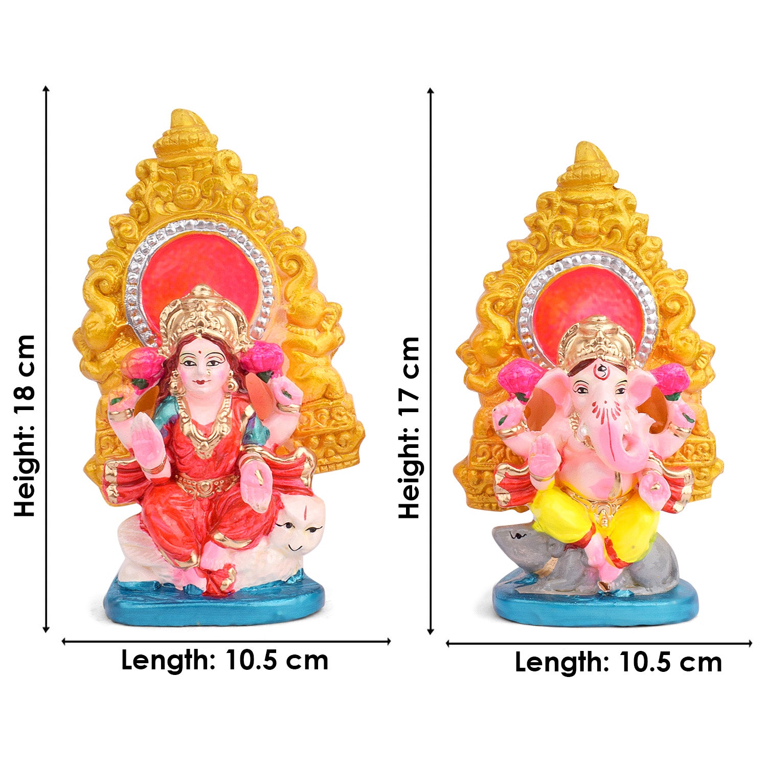 • Product Details: Material: Clay Dimensions: Ganesha: Height: 17cm, Length: 10.5cm, Width: 5.7cm, Laxmi: Height: 18cm, Length: 10.5cm, Width: 5.7cm, Total weight: 557gram, Finish Type: Glossy.