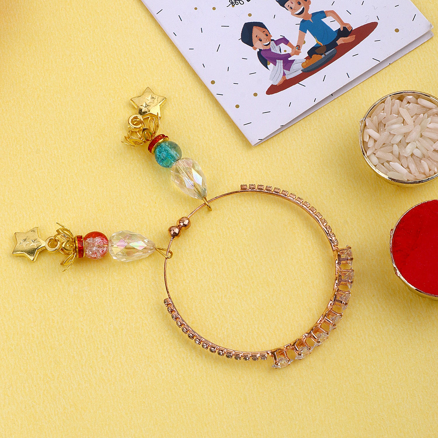 Kundan Bhaiya Rakhi Set of 2: Our Kundan Bhaiya Rakhi set epitomizes elegance and grandeur. Encrusted with dazzling Kundan stones, these rakhis are a symbol of the everlasting bond shared between siblings.