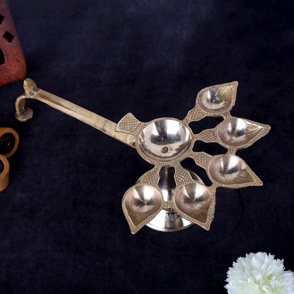 Brass 5 Mukhi Aarti Diya with Handle