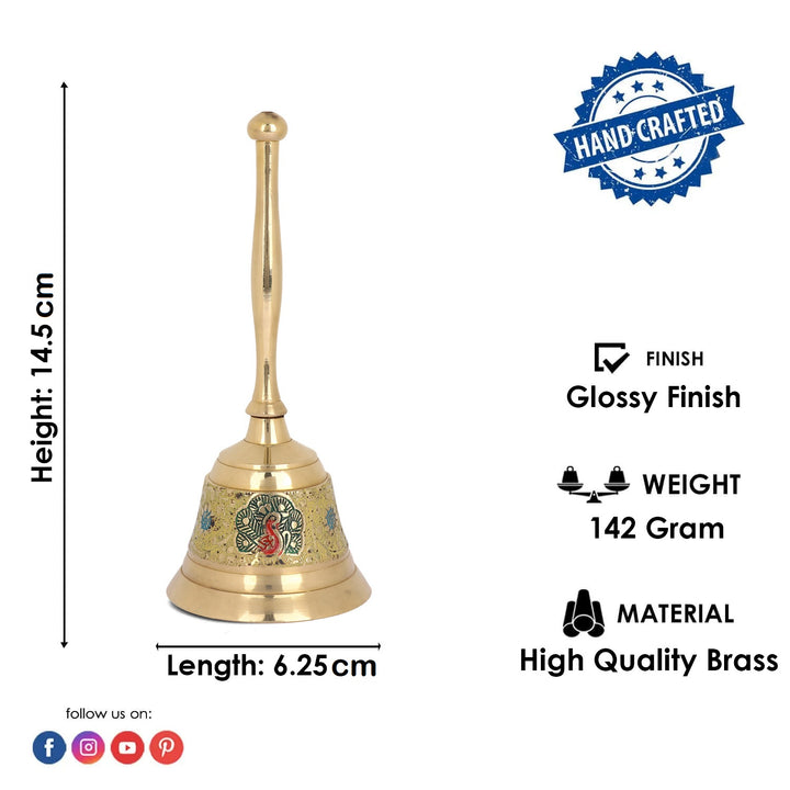 • Description:Β Ringing bells are like a message to the whole world of a new day that starts with a visit to the temple/God making the start of the day- the best one. It is often called as Pooja bell or Ghanti. Handheld bells are held in the left hand and rung continuously while the various other Puja items are offered to God with the right hand. It is considered that the ringing bells ward off an evil spirit and is pleasant to God. Brass Pooja Bell is perfect to your home temple/aarti session and will have everyone mesmerized. The charming sound of this brass hand bell will reach out your prayers to the God and fill the atmosphere with divine sound and live music to the aarti during any Pooja/ceremony and also remove negative energy from your house/ office. Bring a shiny and beautifully crafted auspicious Pooja Bell Made up of Brass Material, Can Be Used for Worship At Home/Temple/Office, also an ideal gift for your loved one.