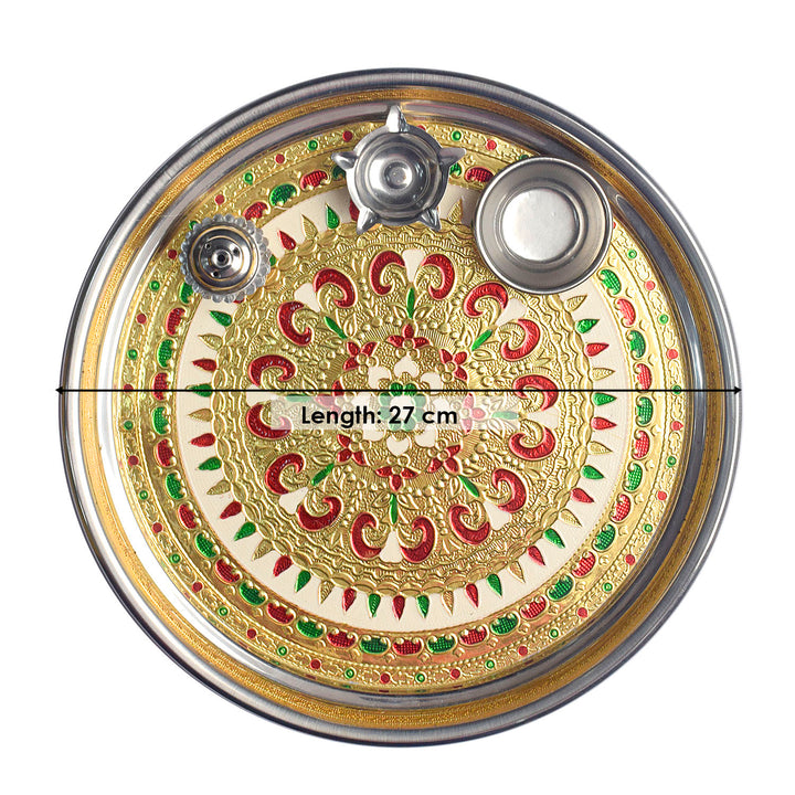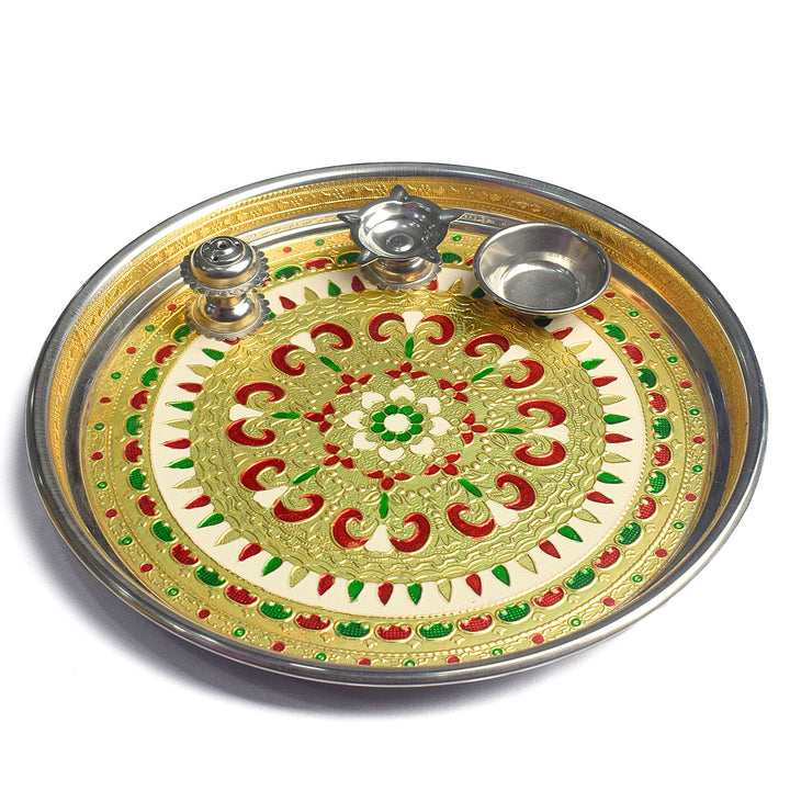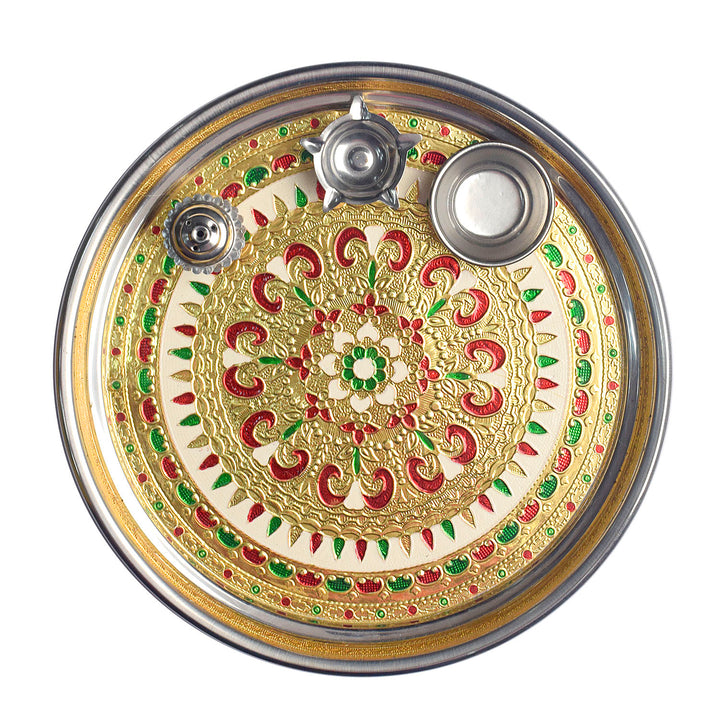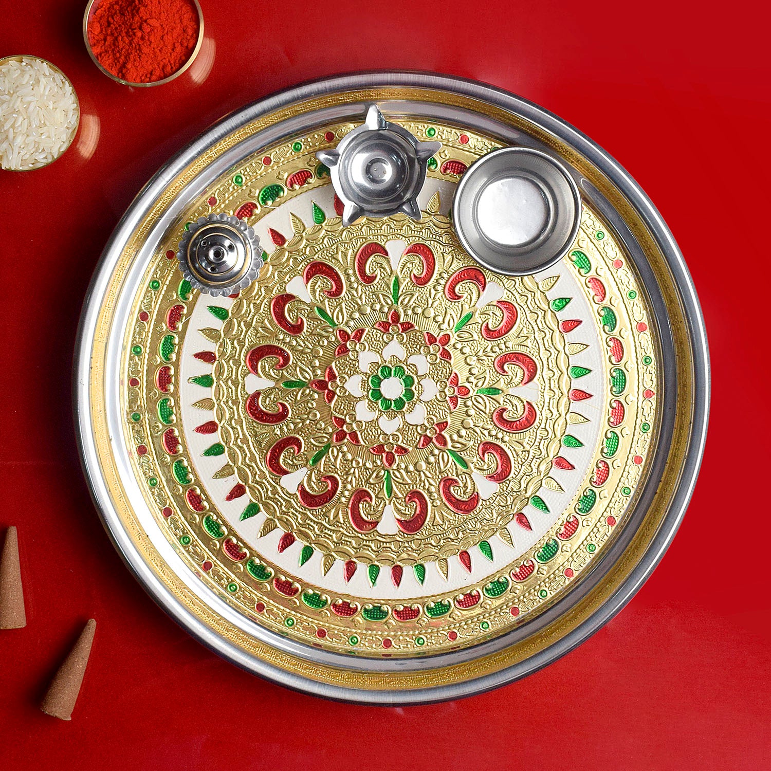 Buy Elegant Steel Printed Pooja Aarti Thali Set | Satvikstore.in – satvikstore.in