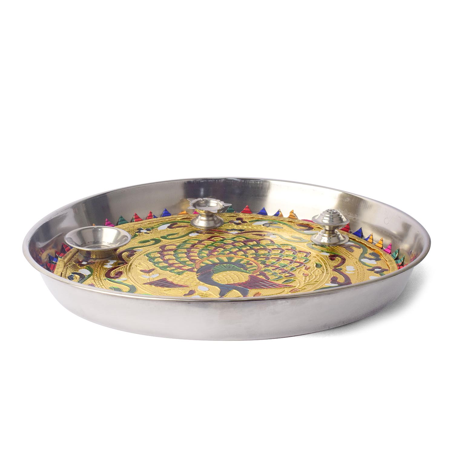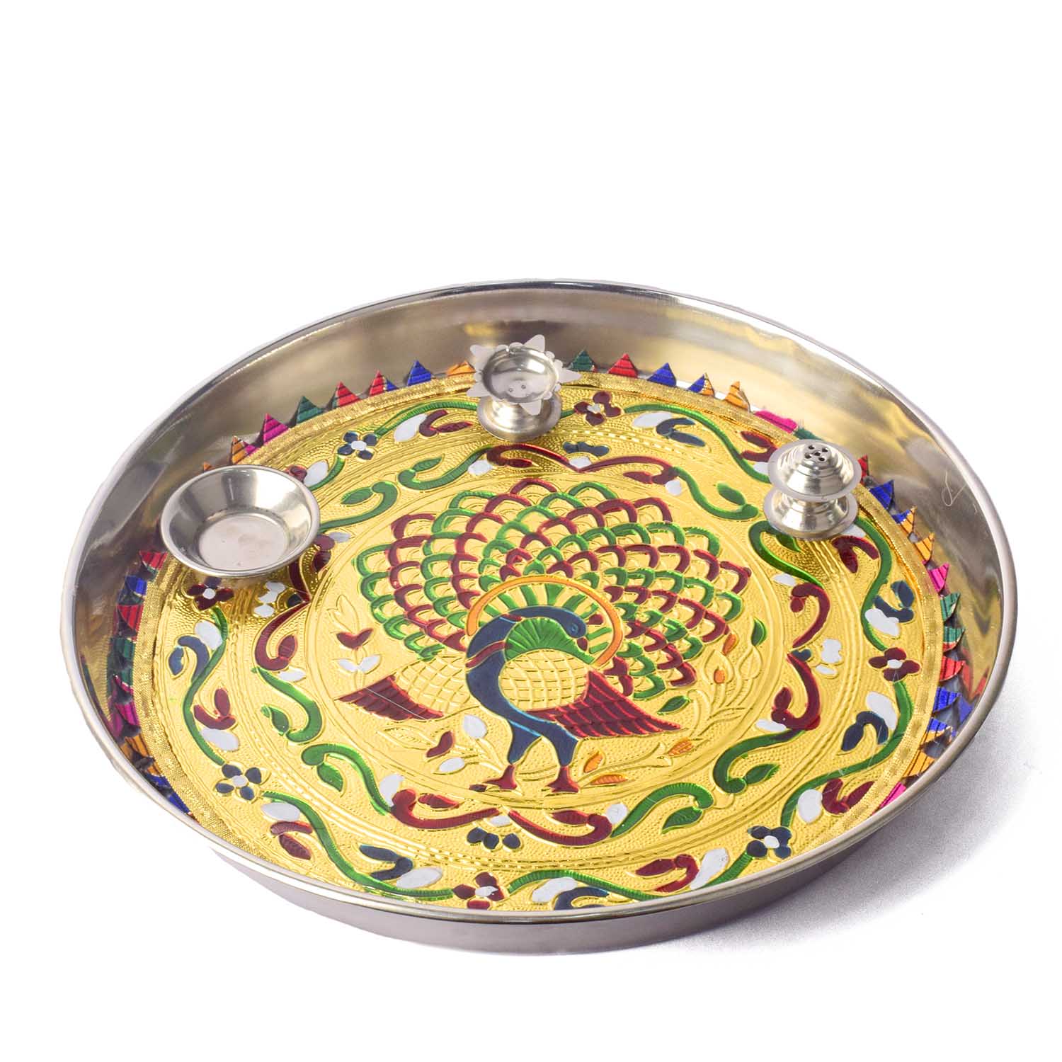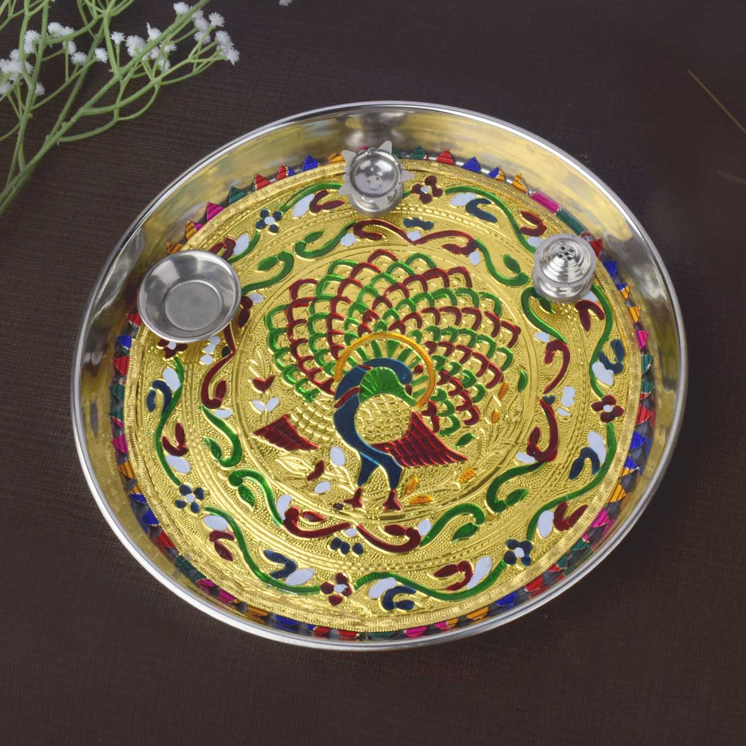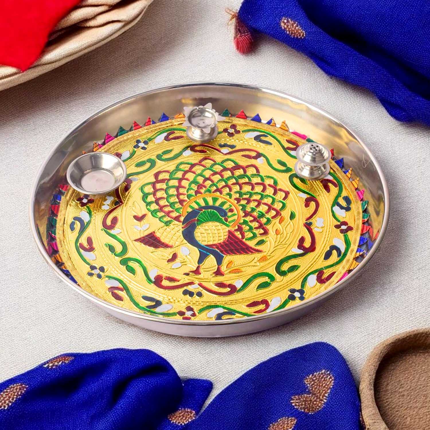 Buy Stainless Steel Peacock Printed Pooja Thali Set | Satvikstore.in – satvikstore.in