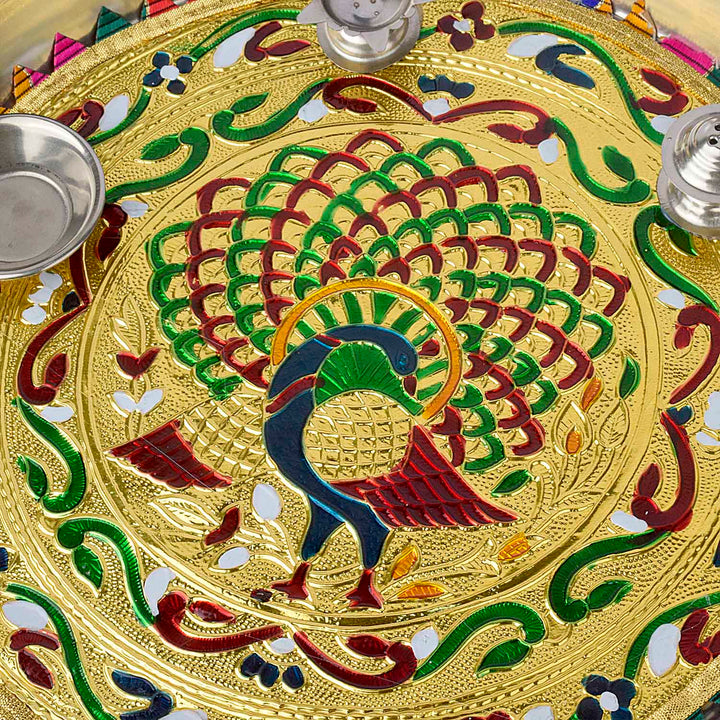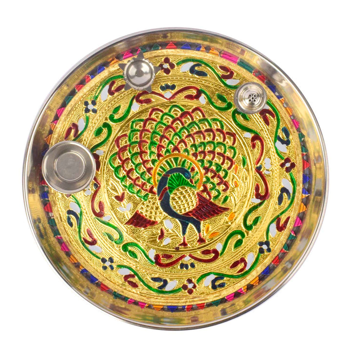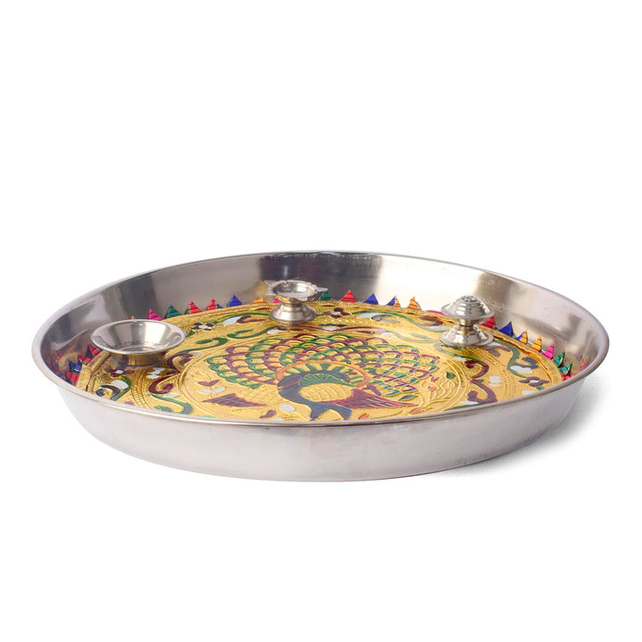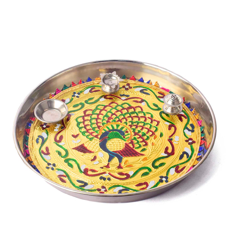 Stainless Steel Peacock Printed Pooja Thali Set