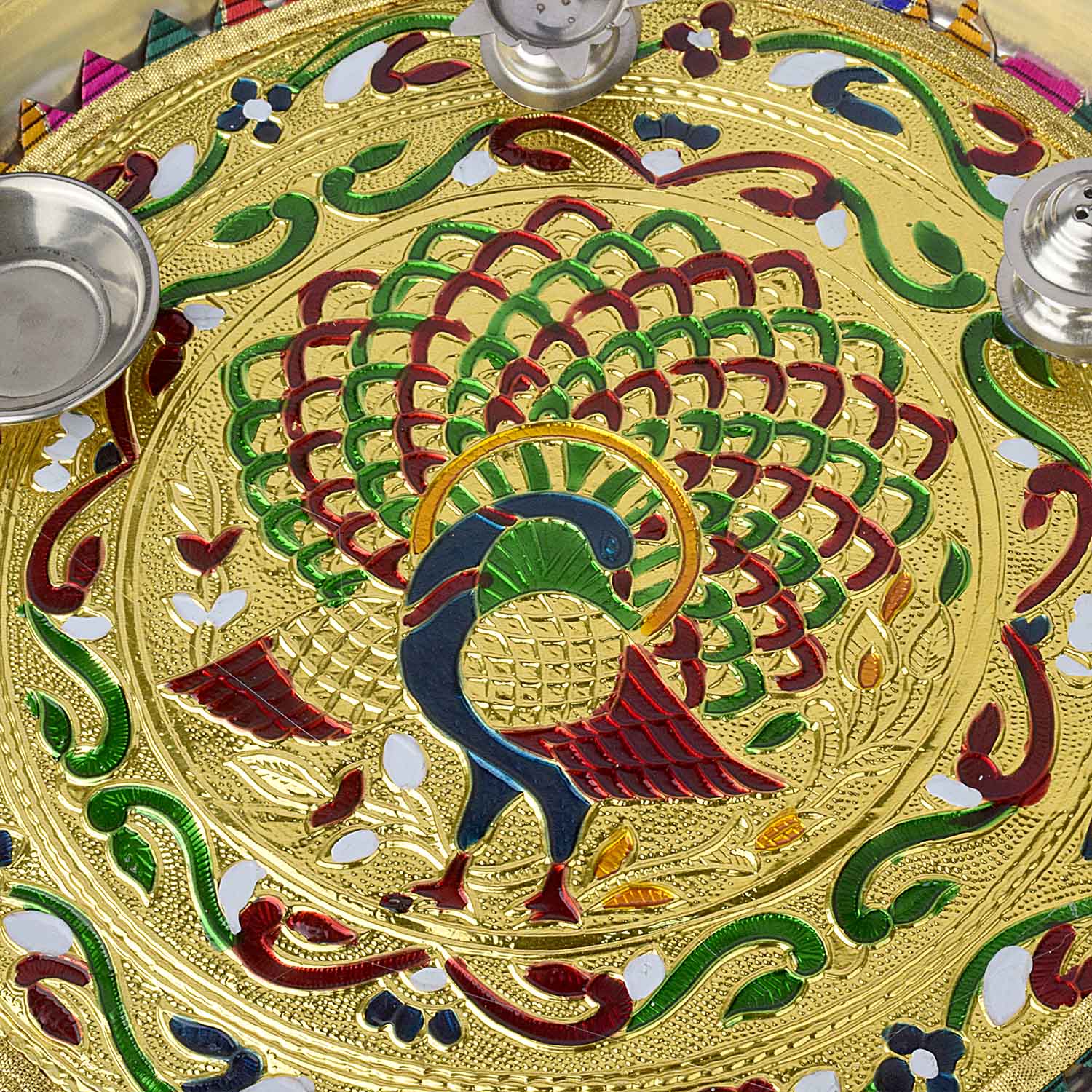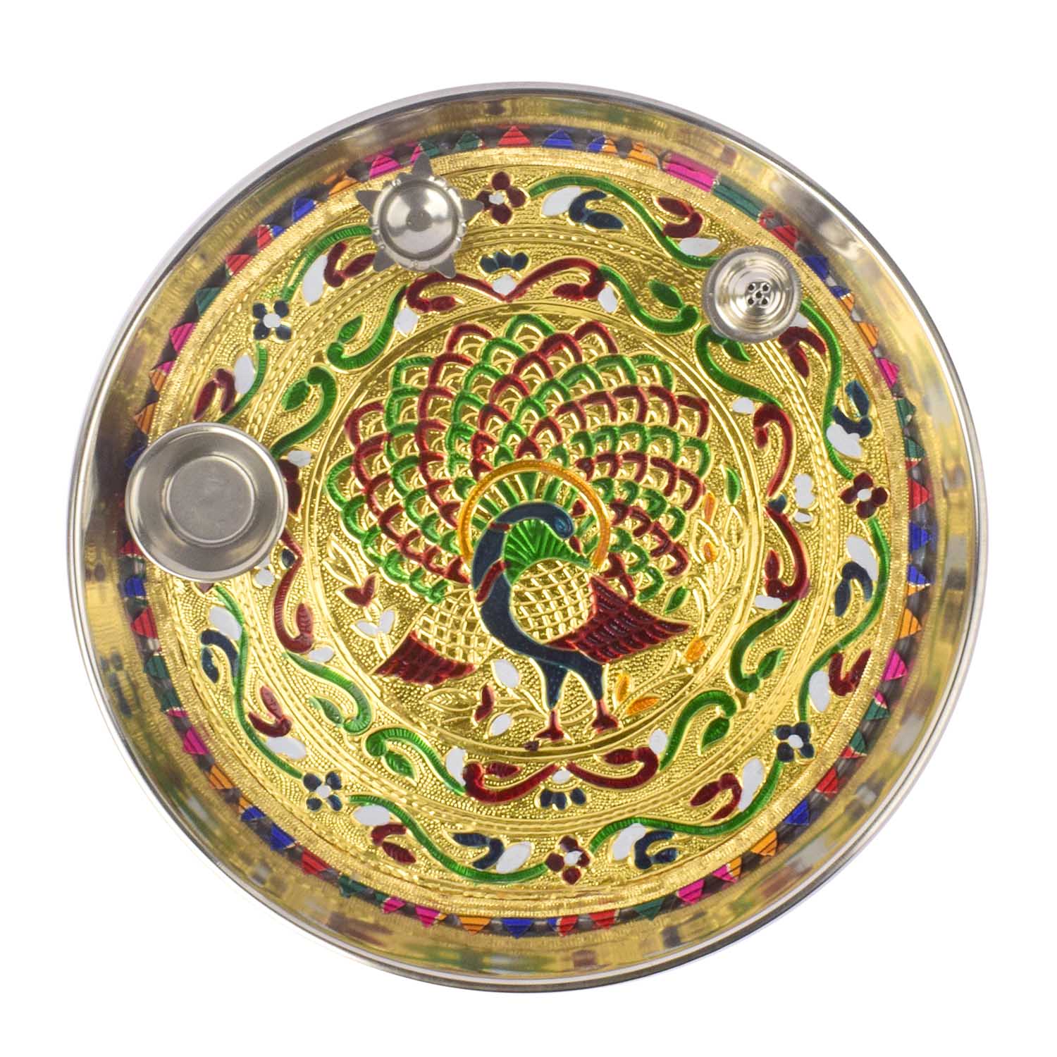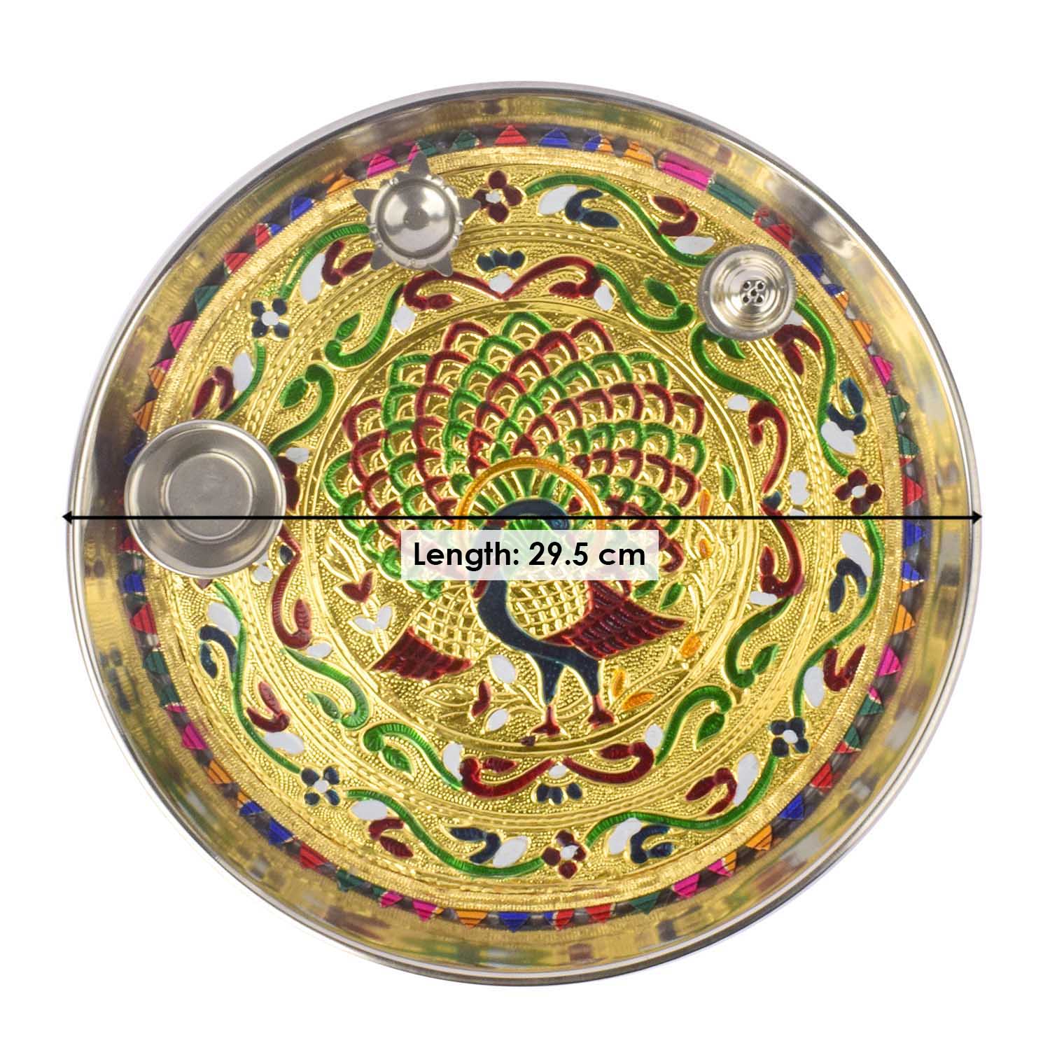 peacock printed pooja thali | stainless steel pooja thali set | designer aarti plate | decorative pooja thali | festive thali set | printed stainless steel thali | peacock design thali | religious pooja plate | steel pooja plate with print | pooja thali for mandir |