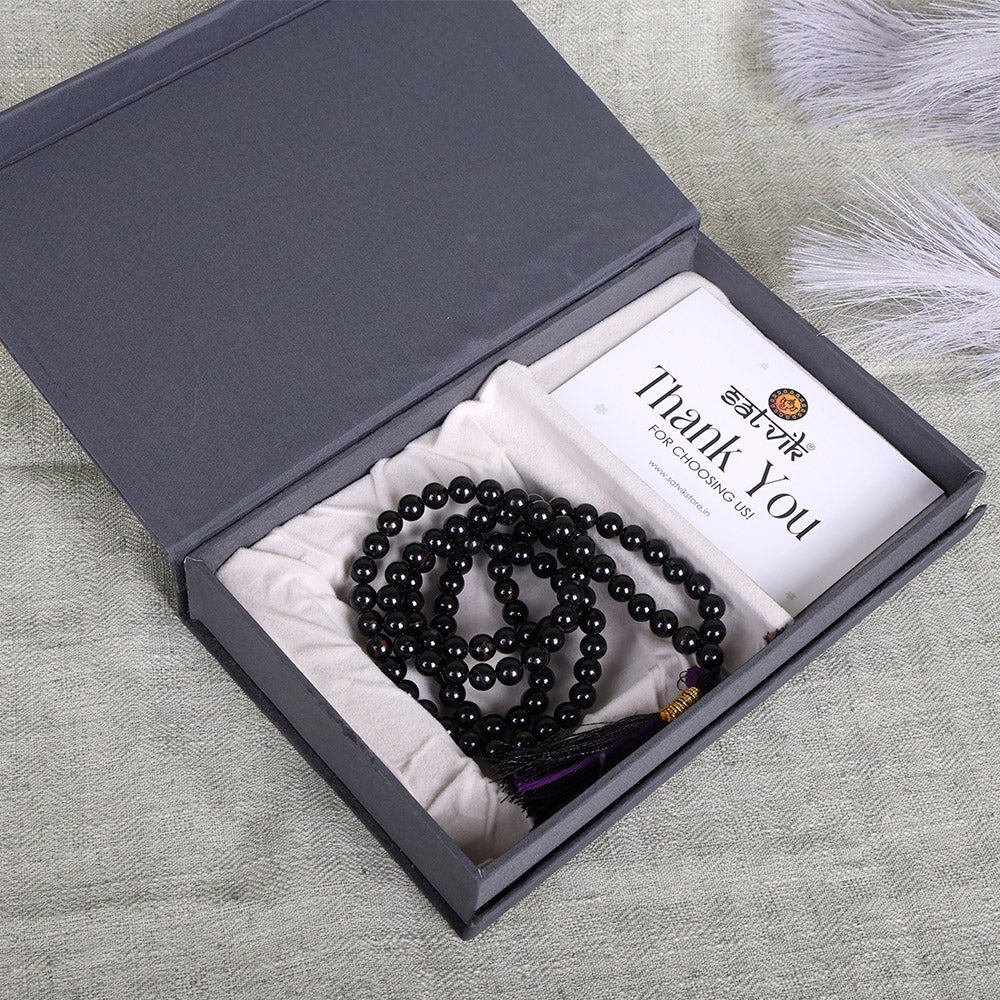 | Ward off negativity and stay grounded with our Black Hakik Mala for Protection, made from pure Black Agate beads.