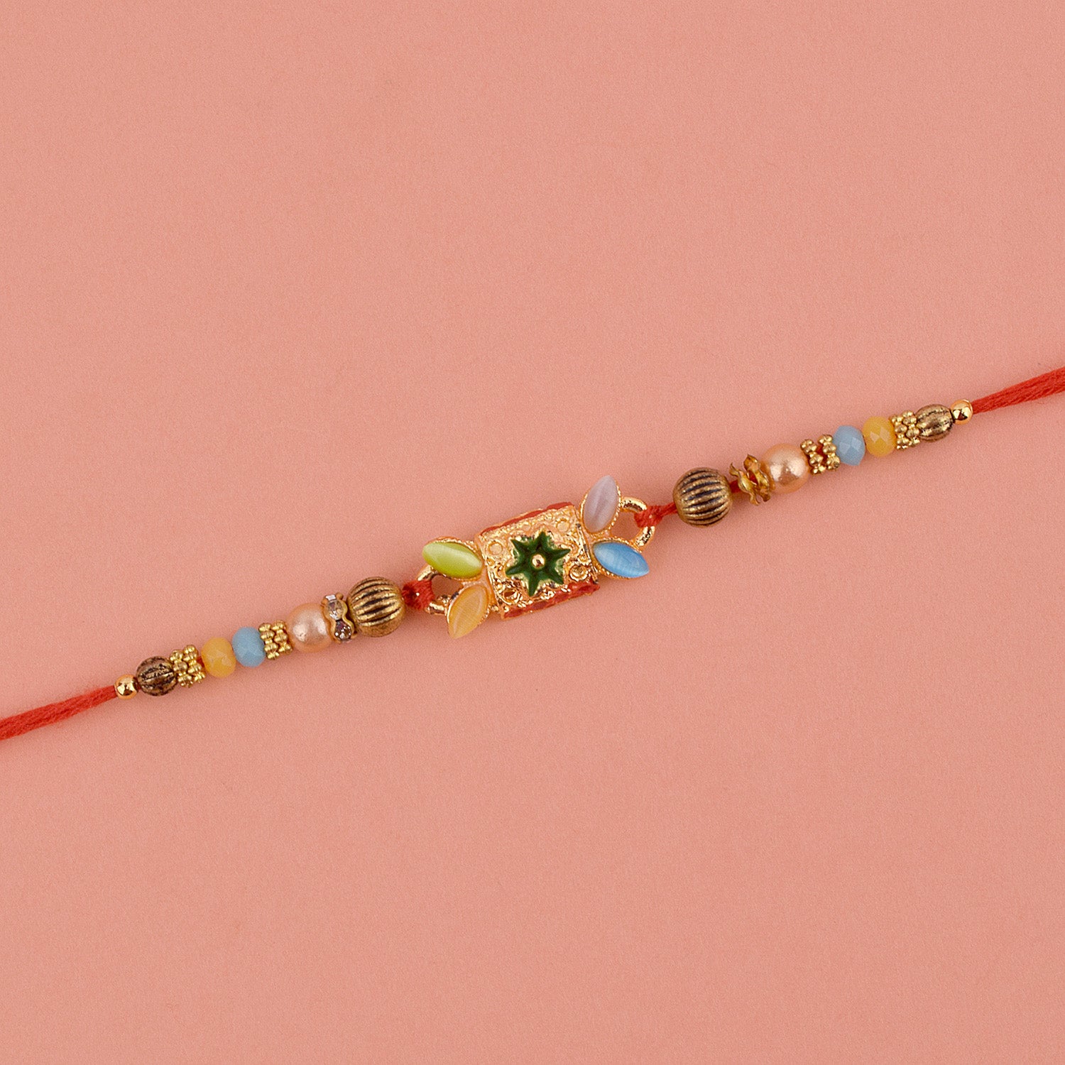 Beaded Rakhi: Adorned with intricate beads, our beaded rakhi collection exudes charm and elegance. Celebrate the joyous bond with your siblings as you tie these vibrant and delightful rakhis on their wrists.