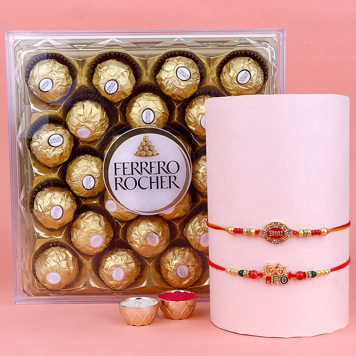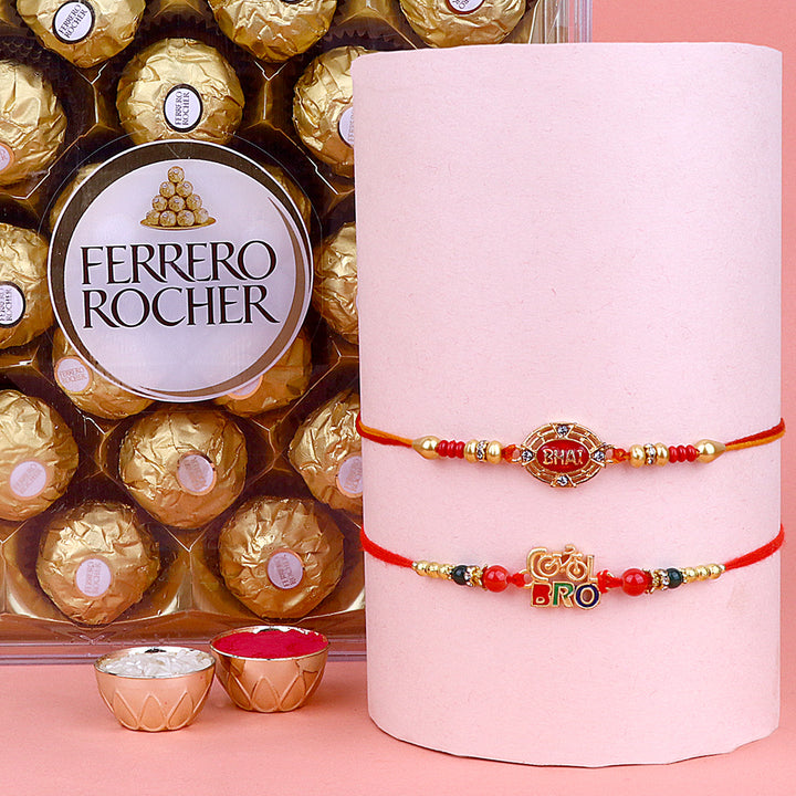 • Package: Set of 2 Bhaiya Rakhi, 1 Greeting card, 1 Roli Chawal Bottle, 1 Chocolate Pack