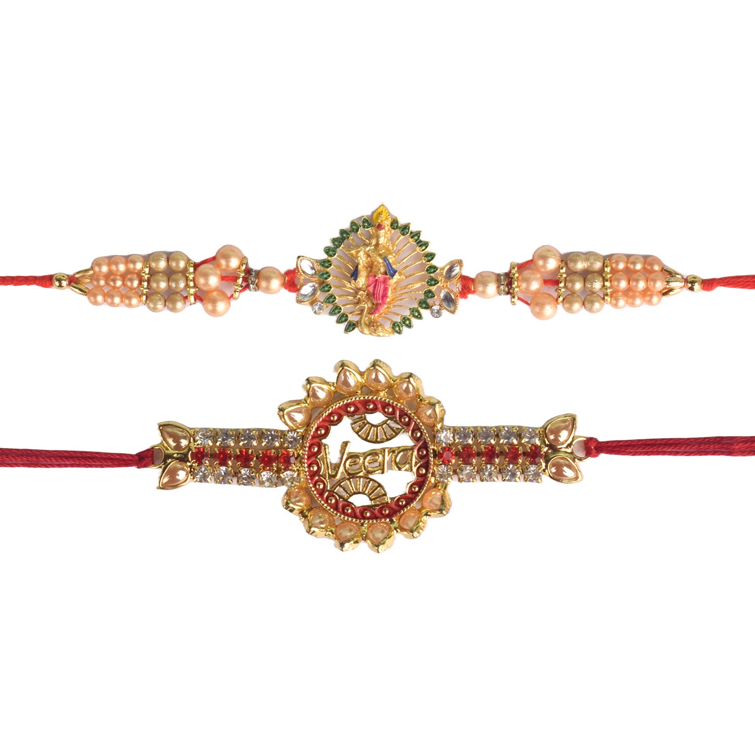 Meenakari Rakhi Set of 2: Adorned with intricate Meenakari work, these rakhis exude the essence of cultural heritage and artistic finesse. The vibrant colors and delicate patterns make these rakhis a true celebration of sibling love.