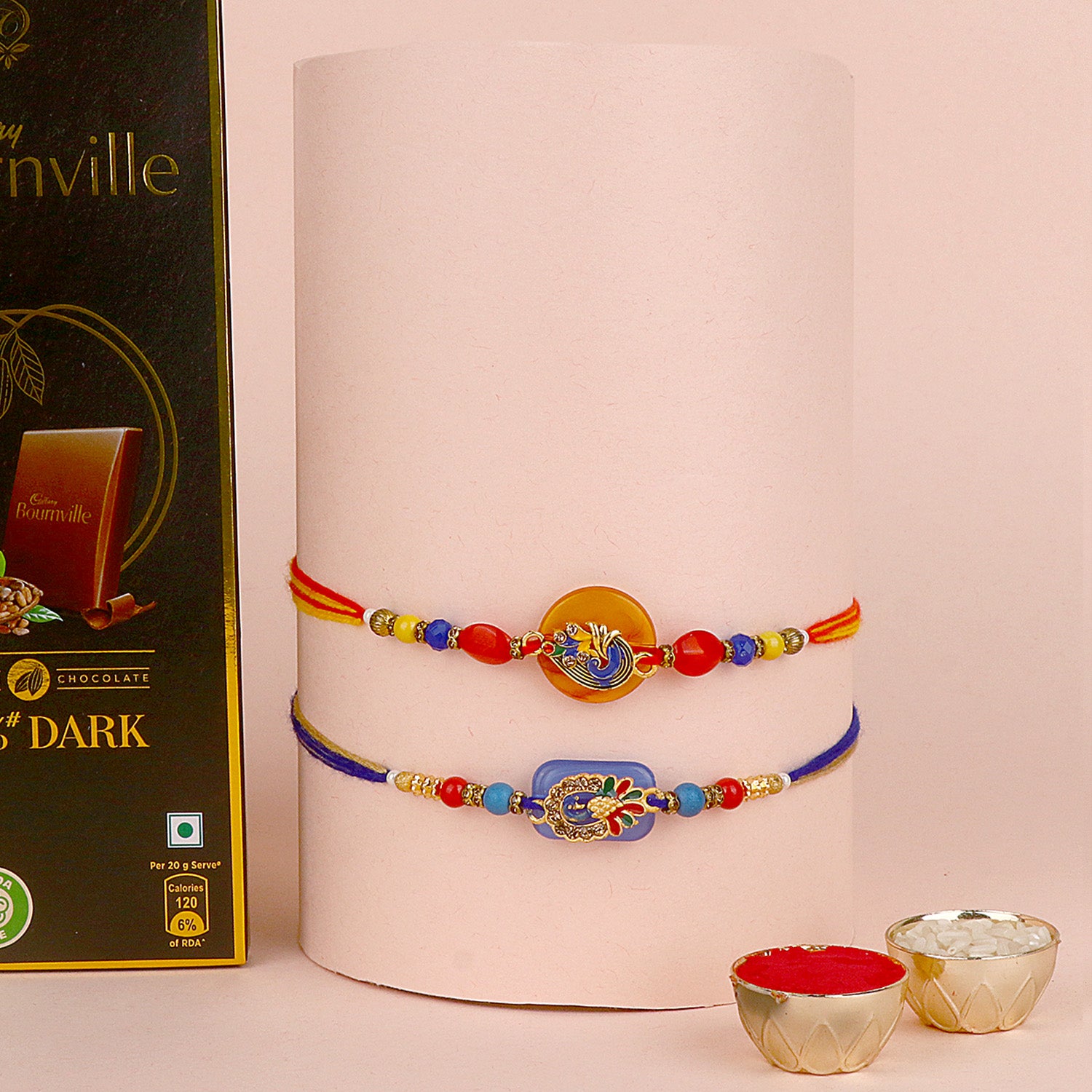 Beaded Bhaiya Rakhi Set of 2: Bedecked with colorful beads, these rakhis represent the joyous moments and cherished memories of growing up together. Embrace nostalgia and affection with this delightful beaded rakhi set.
