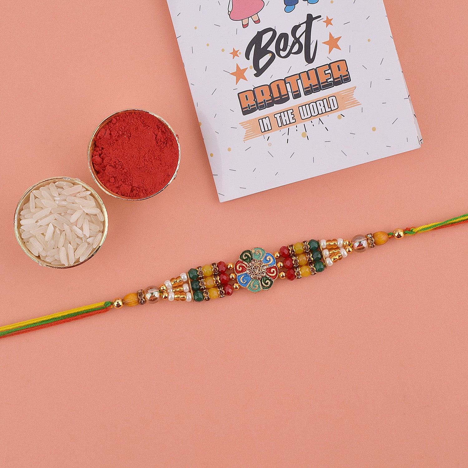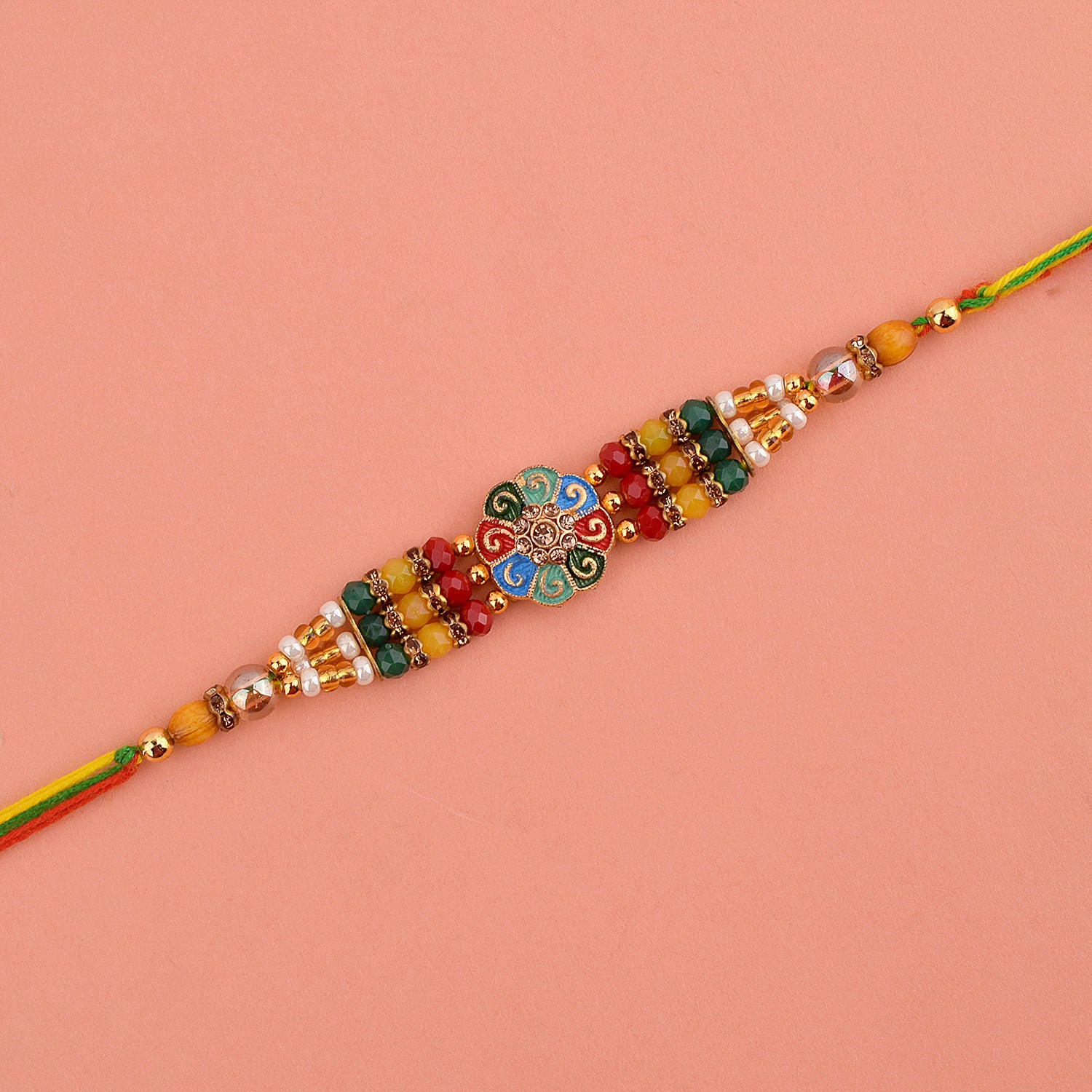 Beaded Rakhi: Adorned with intricate beads, our beaded rakhi collection exudes charm and elegance. Celebrate the joyous bond with your siblings as you tie these vibrant and delightful rakhis on their wrists.