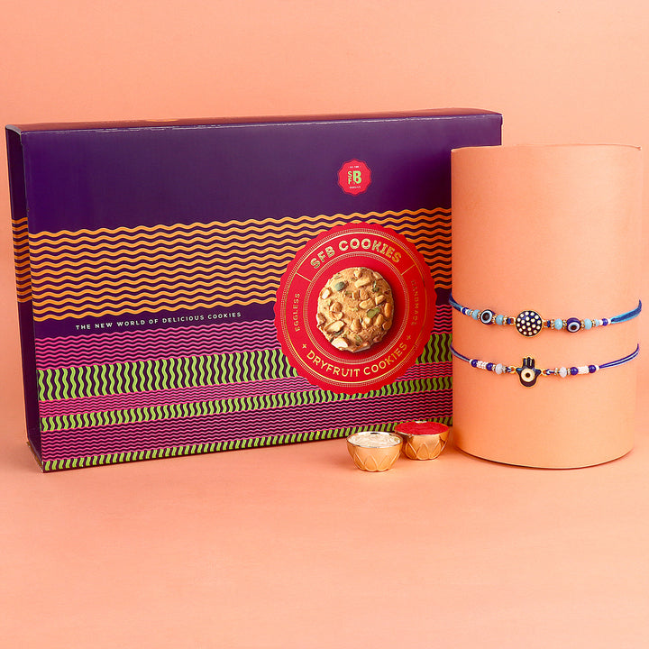 • About Product: Celebrate the joyous occasion of Rakhi with our delightful Rakhi with Cookies gift set. This perfect combination features a beautifully crafted Rakhi symbolizing the bond between siblings, paired with a selection of scrumptious cookies that will leave your taste buds craving for more. Indulge in the mouthwatering flavors and textures of these delectable treats, perfectly complementing the heartfelt sentiments shared between brothers and sisters. Whether you're near or far, our Rakhi with Cookies gift set is a sweet and thoughtful way to express your love and strengthen the cherished bond you share. Make this Raksha Bandhan truly memorable with this irresistible combination.