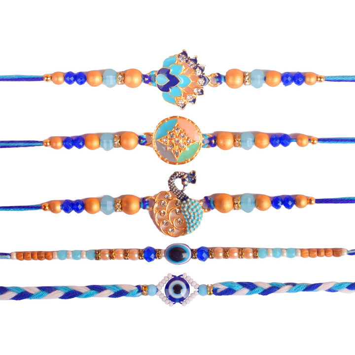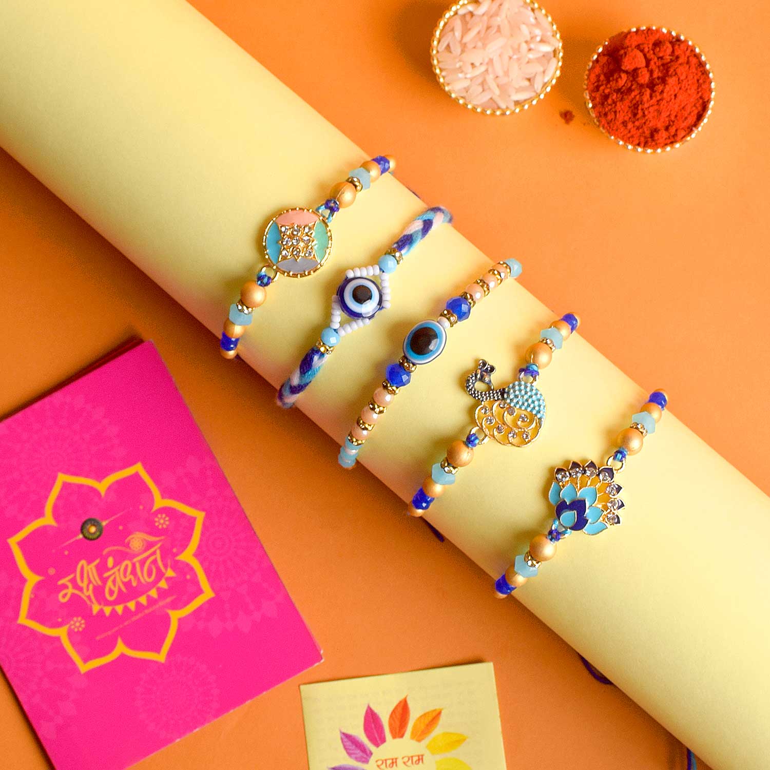 Set of 5 Rakhi | Designer Rakhi Combo | Rakhi Gift Set | Rakhi with Roli Chawal | Buy Rakhi Online | Raksha Bandhan Rakhi Combo | Traditional Rakhi Set | Rakhi for Brother | Rakhi with Blessings Stickers | Family Rakhi Set