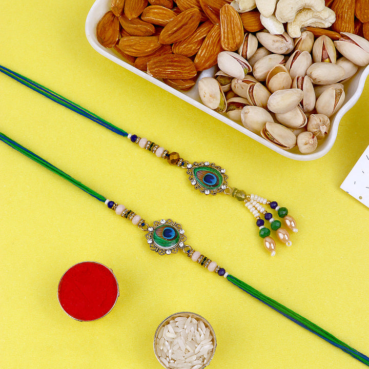 Beaded Bhaiya Rakhi Set of 2: Bedecked with colorful beads, these rakhis represent the joyous moments and cherished memories of growing up together. Embrace nostalgia and affection with this delightful beaded rakhi set.