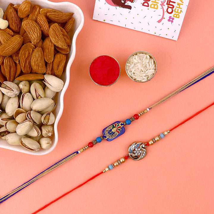 Meenakari Rakhi Set of 2: Adorned with intricate Meenakari work, these rakhis exude the essence of cultural heritage and artistic finesse. The vibrant colors and delicate patterns make these rakhis a true celebration of sibling love.