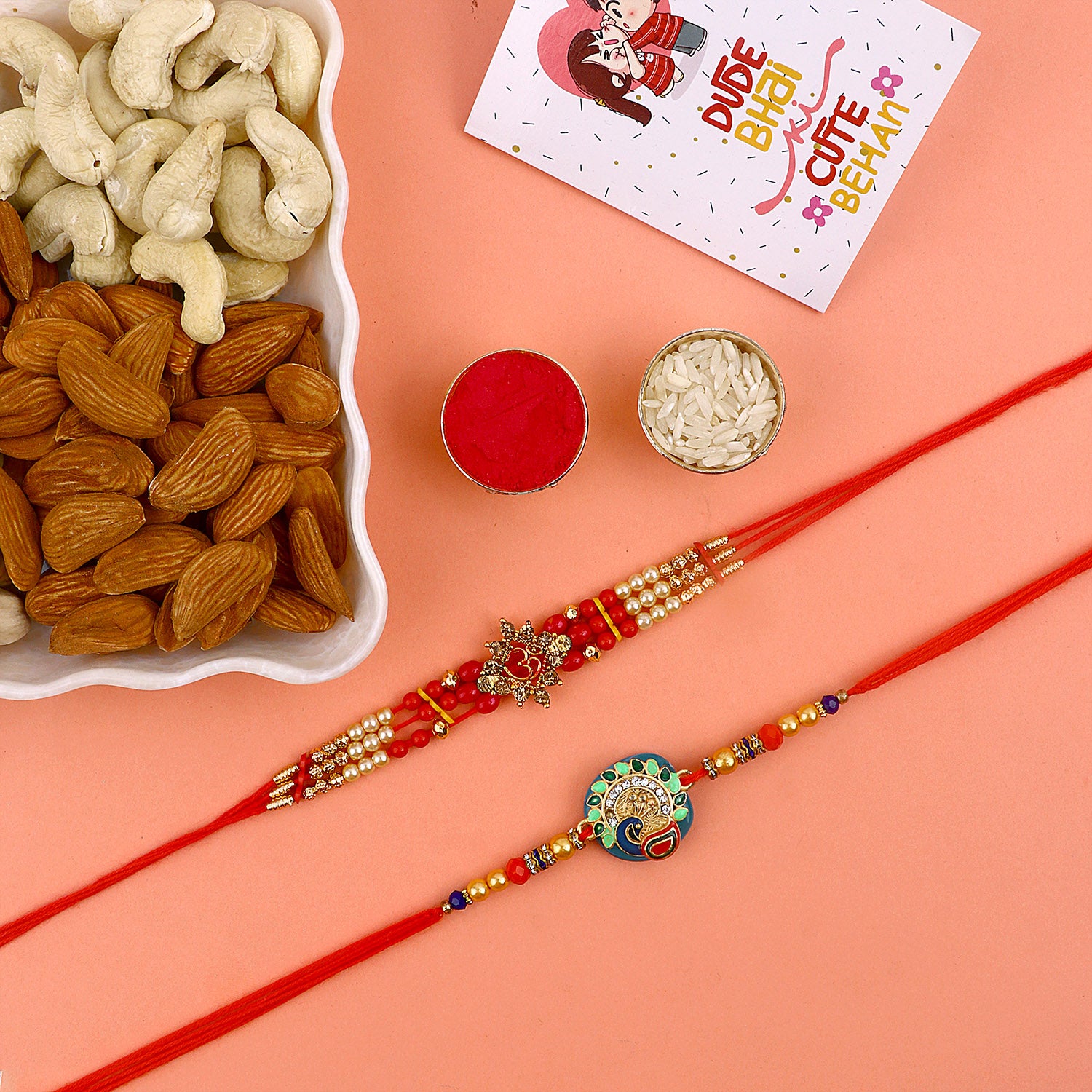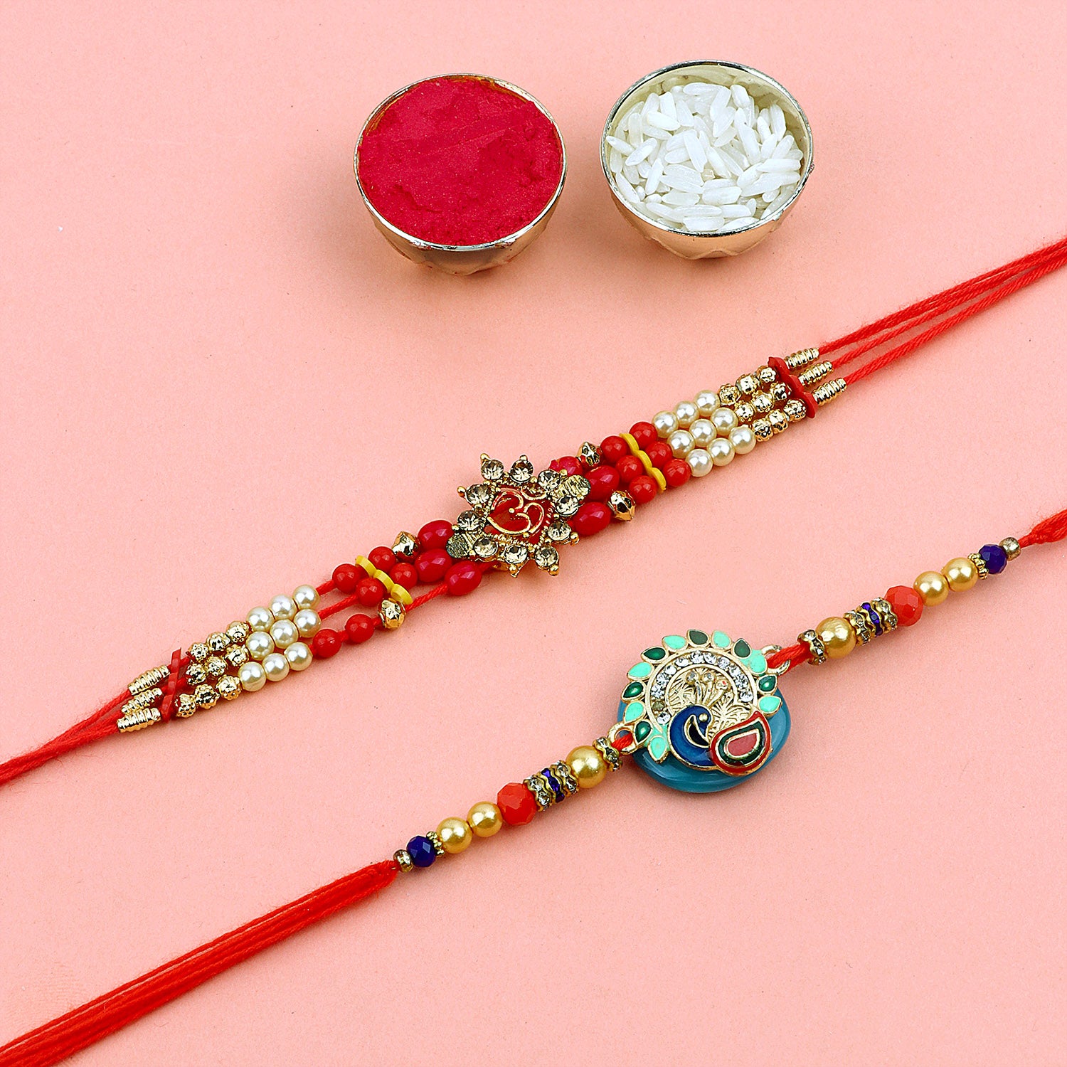 Beaded Bhaiya Rakhi Set of 2: Bedecked with colorful beads, these rakhis represent the joyous moments and cherished memories of growing up together. Embrace nostalgia and affection with this delightful beaded rakhi set.