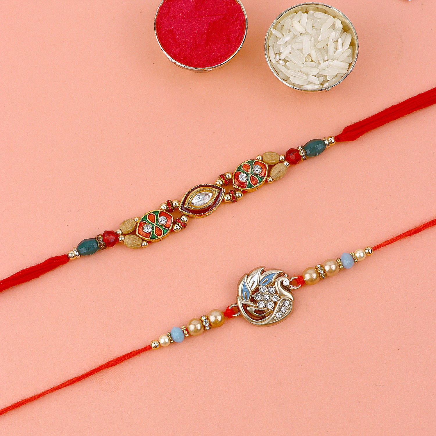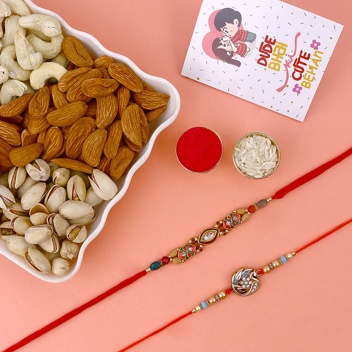 Meenakari Rakhi Set of 2: Adorned with intricate Meenakari work, these rakhis exude the essence of cultural heritage and artistic finesse. The vibrant colors and delicate patterns make these rakhis a true celebration of sibling love.