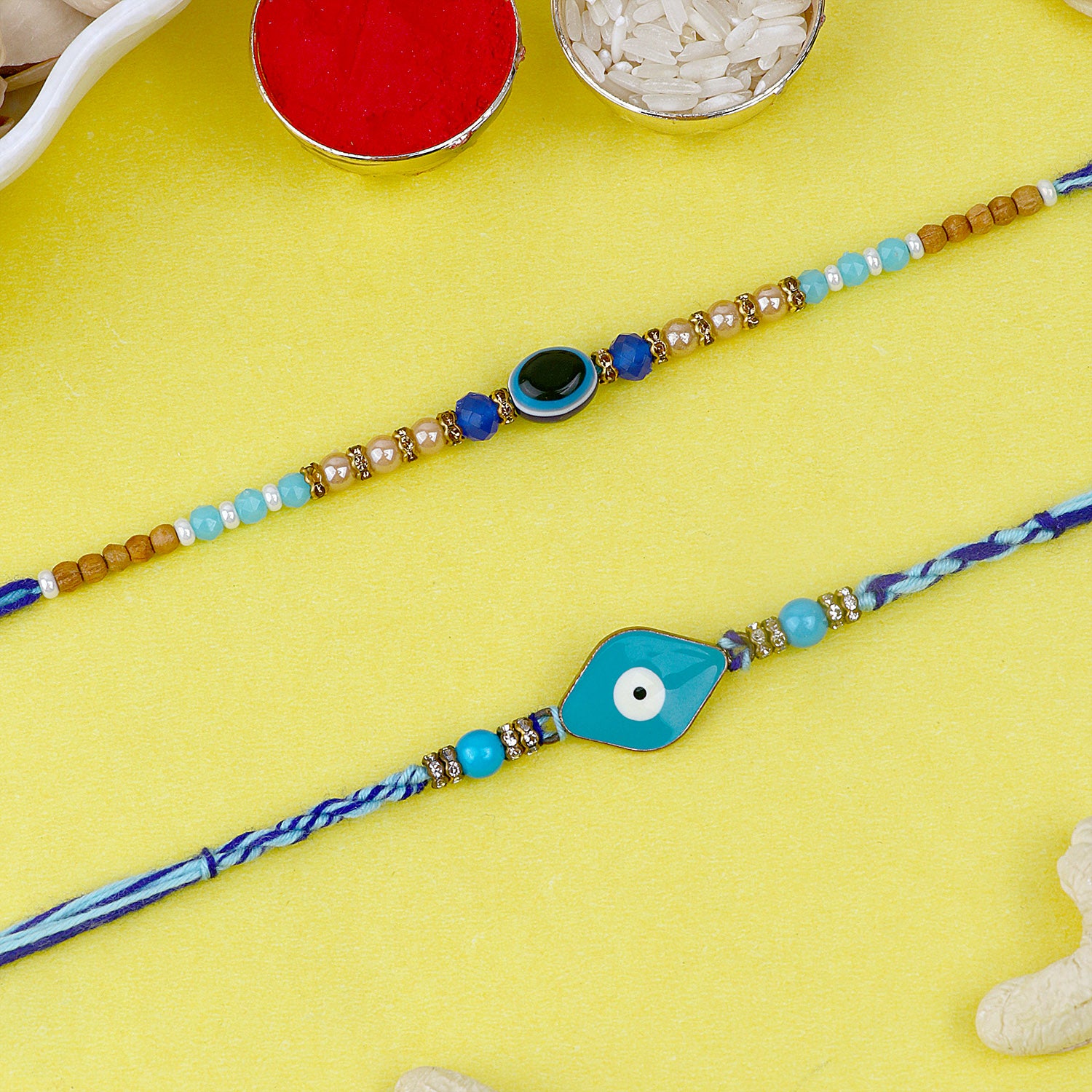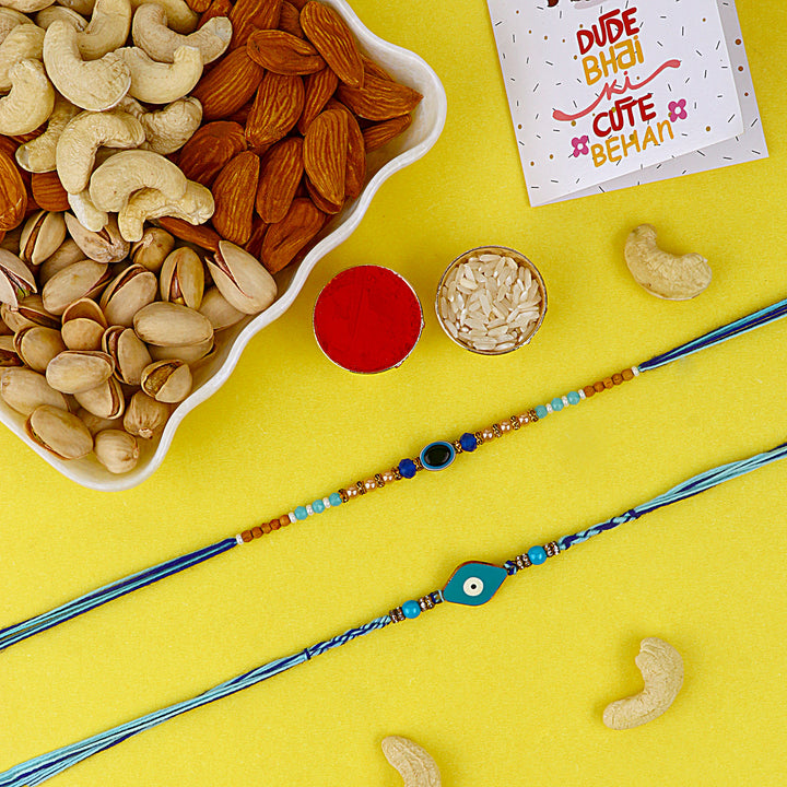 Beaded Bhaiya Rakhi Set of 2: Bedecked with colorful beads, these rakhis represent the joyous moments and cherished memories of growing up together. Embrace nostalgia and affection with this delightful beaded rakhi set.