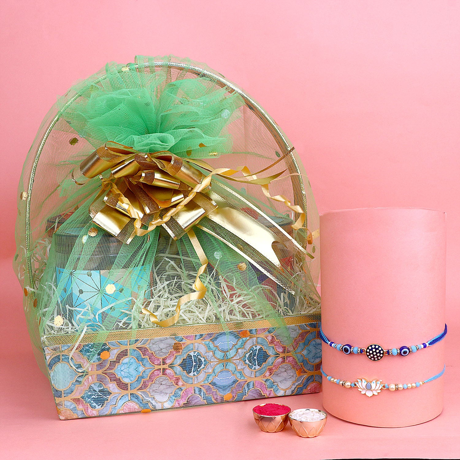 Our Bhaiya Rakhi with Gift Hamper is a delightful combination that includes a beautifully handcrafted Rakhi, lovingly designed to symbolize the bond between siblings, along with an assorted gift hamper packed with goodies and tokens of affection. This exclusive Rakhi hamper is a perfect way to shower your brother with love and blessings on this auspicious day.