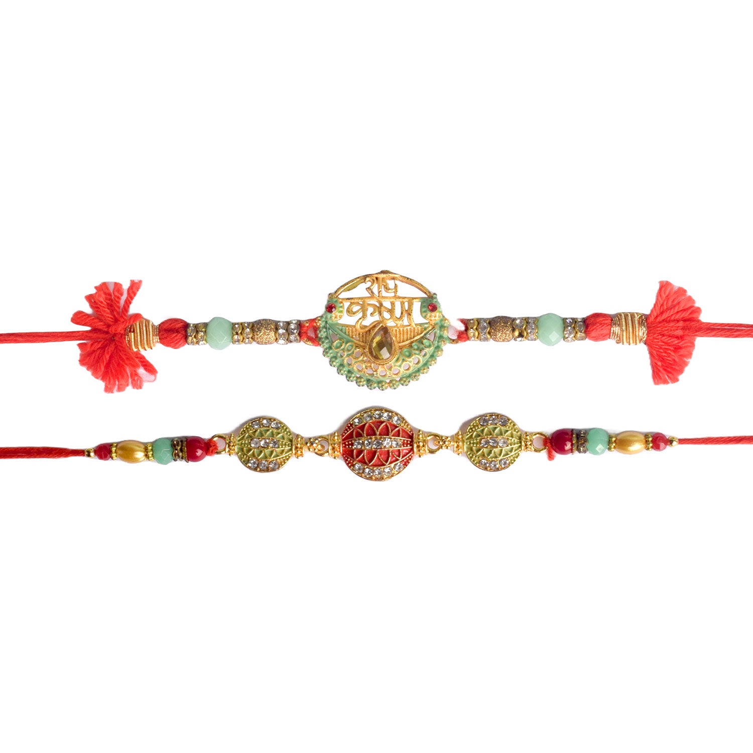 Meenakari Rakhi Set of 2: Adorned with intricate Meenakari work, these rakhis exude the essence of cultural heritage and artistic finesse. The vibrant colors and delicate patterns make these rakhis a true celebration of sibling love.