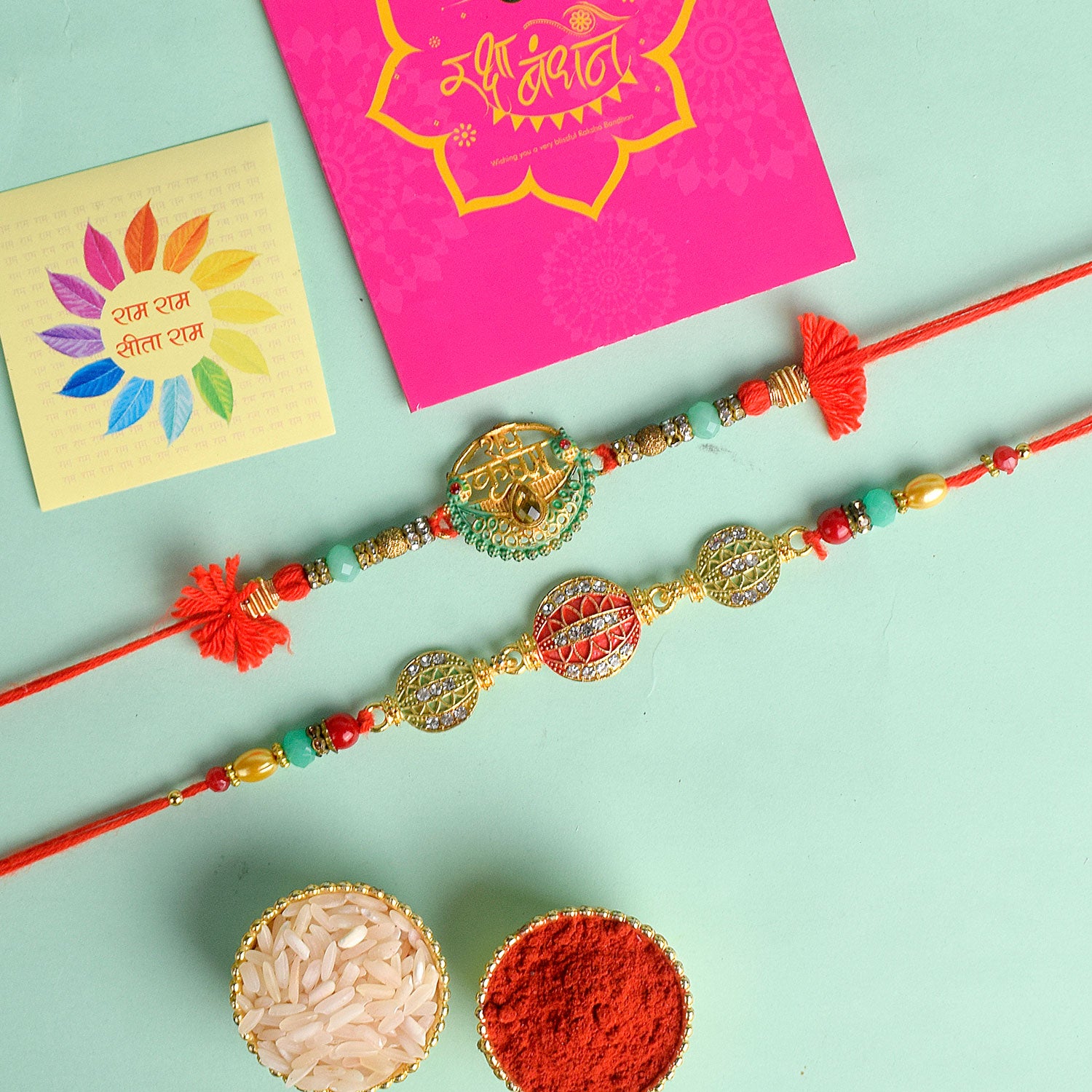 • Item Name: Traditional Rakhi Set of 2 with Roli Chawal & Ram Sita Stickers