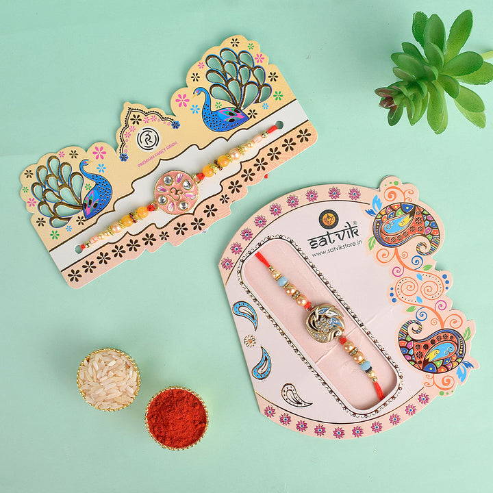 Beaded Bhaiya Rakhi Set of 2: Bedecked with colorful beads, these rakhis represent the joyous moments and cherished memories of growing up together. Embrace nostalgia and affection with this delightful beaded rakhi set.