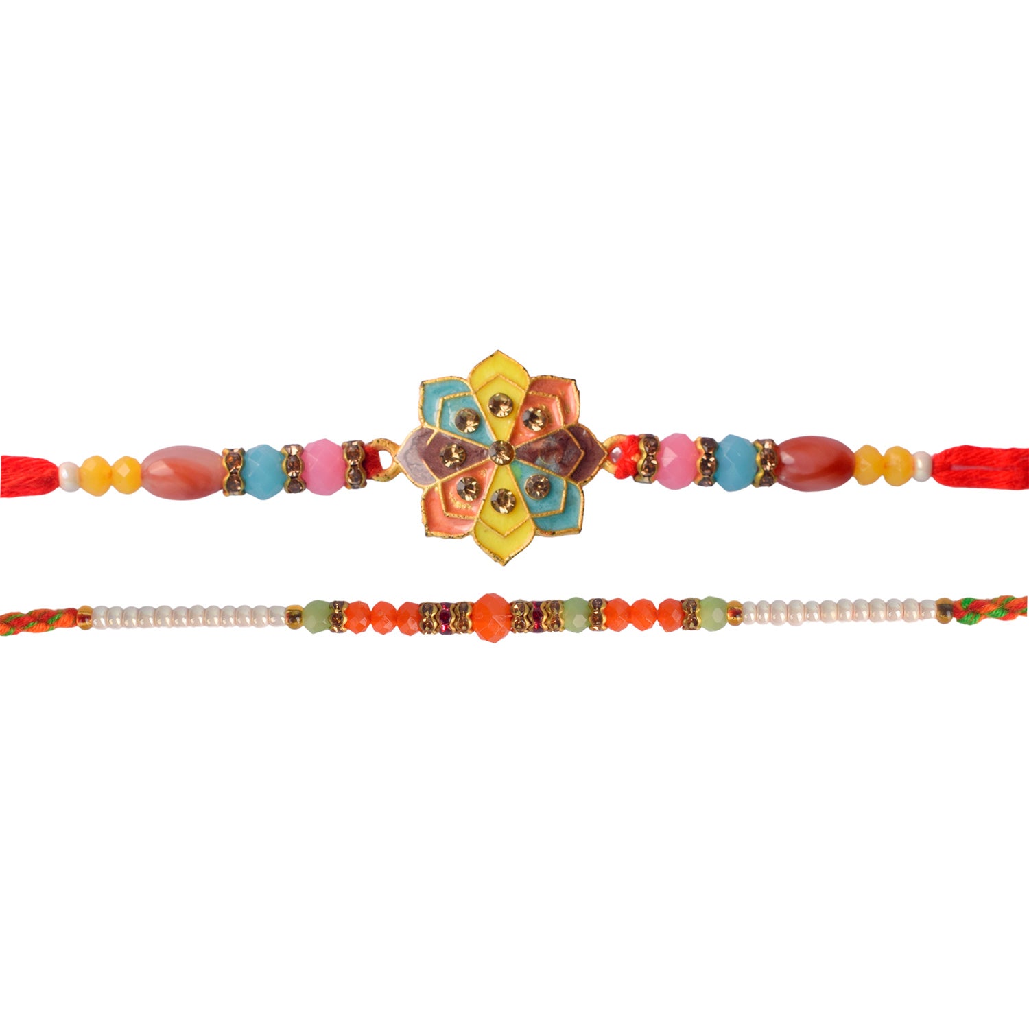 Beaded Bhaiya Rakhi Set of 2: Bedecked with colorful beads, these rakhis represent the joyous moments and cherished memories of growing up together. Embrace nostalgia and affection with this delightful beaded rakhi set.