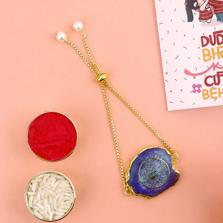 • Package: 1 Pc Agate Stone Gayatri Mantra Rakhi, Roli Akshat, Greeting Card