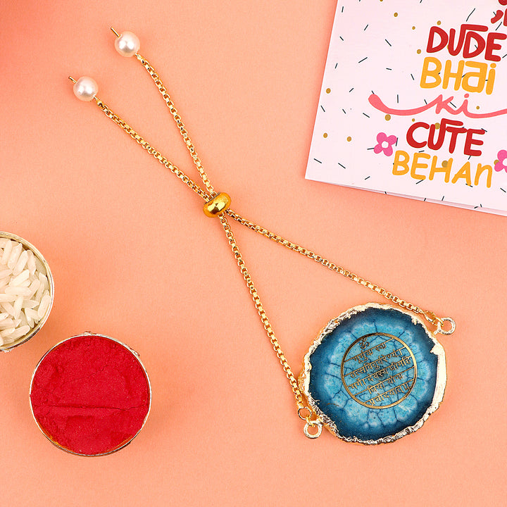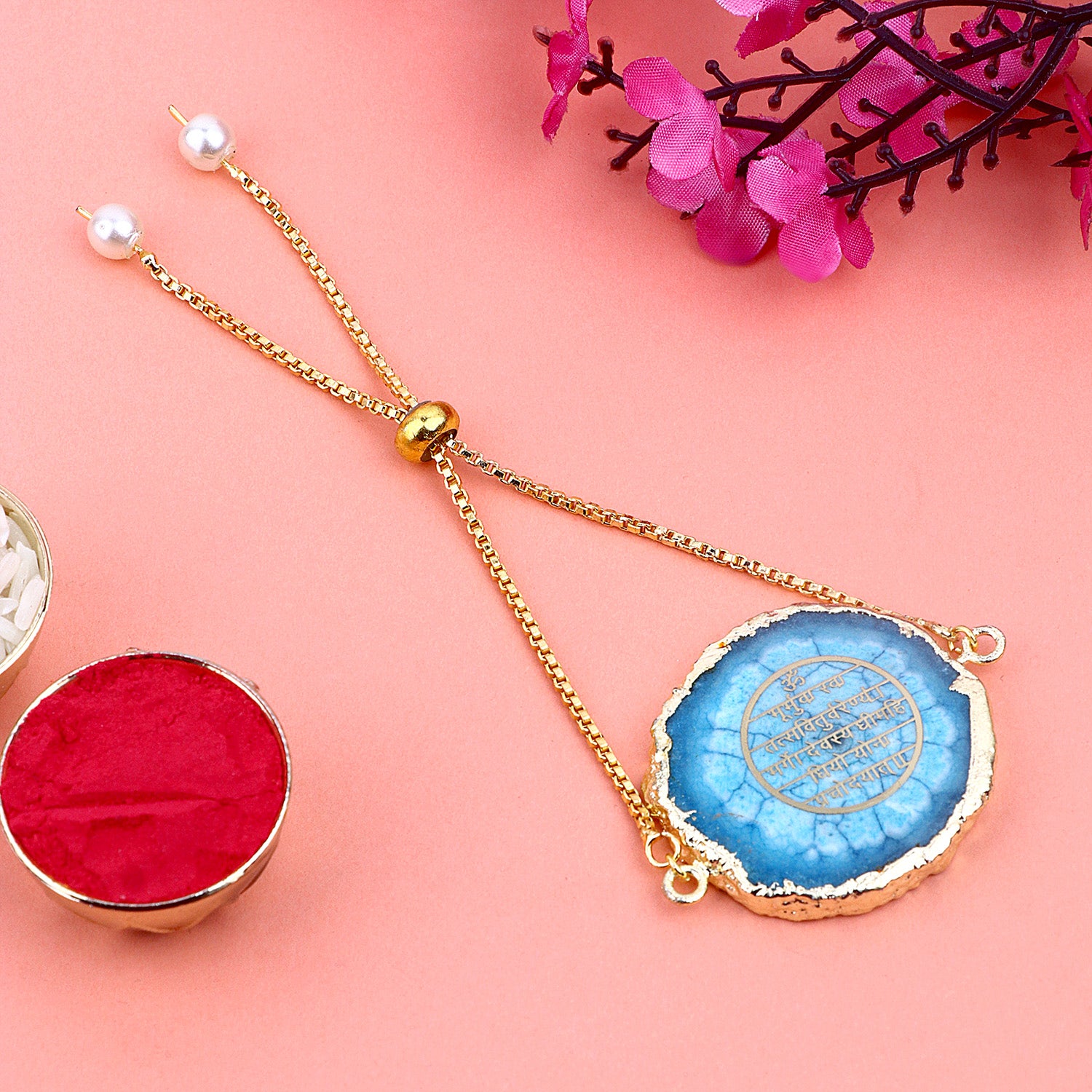 • Package: 1 Pc Agate Stone Gayatri Mantra Rakhi, Roli Akshat, Greeting Card
