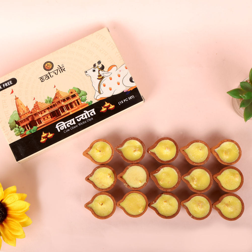 45 min cow ghee diya | nitya jyot cow ghee diya | 45-minute cow ghee diya | long burning cow ghee diya | eco-friendly ghee diya | pure cow ghee diya for pooja | spiritual ghee diya | handmade cow ghee diya | traditional nitya jyot diya | satvikstore cow ghee diya